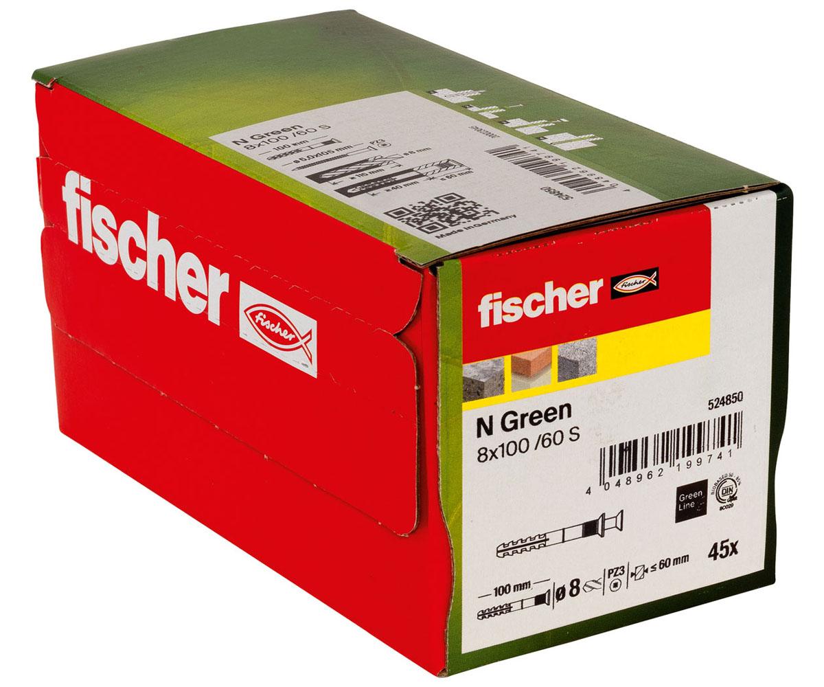 Der fischer Nageldübel N Green mit Senkkopf besteht aus einer Dübelhülse aus Kunststoff und einer galvanisch verzinkten Nagelschraube. Diese sind für eine schnelle Montage bereits vormontiert. Das Granulat zur Herstellung des fischer Nageldübels N Green wird mindestens zur Hälfte aus nachwachsenden Rohstoffen gewonnen. Diese stehen nicht in Konkurrenz zu Anbauflächen für Nahrungs- und Futtermittel. Der Nageldübel N Green verfügt über die gleichen Leistungsmerkmale und Tragfähigkeit wie das Original. Der Nageldübel wird in der zeitsparenden Durchsteckmontage durch das Anbauteil eingeführt. Beim Einschlagen der Nagelschraube spreizt die Dübelhülse auf und verankert sicher im Baustoff. Der fischer Nageldübel N Green mit Senkkopf ist ideal für die Befestigung von Holzkonstruktionen in allen Baustoffen im Innenbereich.
