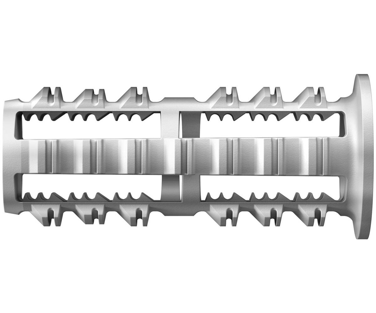 - Die Rastnasen im Dübelinnern ermöglichen die Aufnahme handelsüblicher, metrischer Gewinde. Dies spart ein großes Sortiment an Stockschrauben.