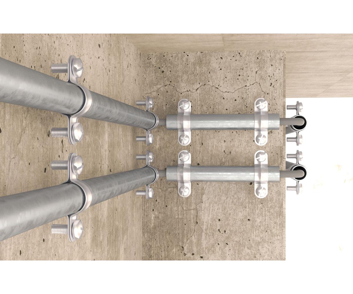 Die fischer Schraubabstandsschelle Metall AM ist eine montagefreundliche Lösung zur Befestigung von Stahlpanzerrohren und Elektrokabeln. Die Metallschelle mit Gewinde kann mit dem fischer Nagelanker FNA II 6 x 30 M 6 x 41 und wahlweise mit den Stockschrauben STST 6 x 60 und STST 6 x 80 in Beton, Vollstein und Spannbeton-Hohlplatten befestigt werden. Mit dem fischer Nageldübel N 6 x 40 / 10 M 6 hält die Abstandsschelle sicher in Beton, aber auch in Vollstein, Mauerziegel und Leichtbeton.