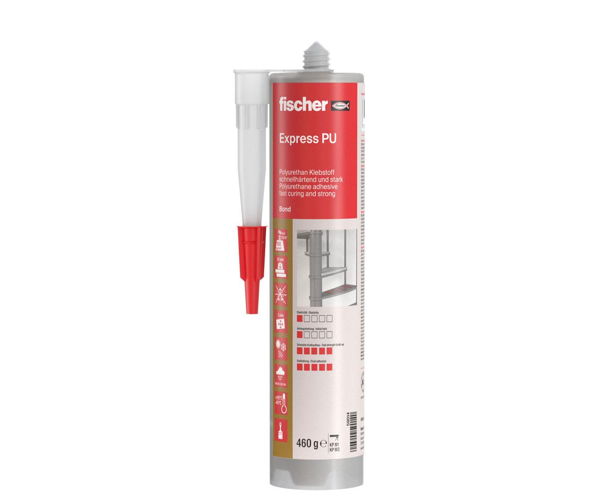 Der fischer Express PU mit seiner extrem hohen Endfestigkeit eignet sich ideal zum schnellen und wasserfesten Verbinden unterschiedlicher Baustoffe, einschließlich Naturstein, Styropor und nicht saugenden Materialien. Der Klebstoff befestigt Holzunterkonstruktionen, Laminatverkleidungen, Fuß- und Sockelleisten, Dekor-, Akustik- und Dämmplatten und kann im professionellen Modellbau eingesetzt werden. Die schnelle Funktionsfestigkeit nach 10 Minuten garantiert eine einfach Montage. Zudem ist er wärmebeständig bis +110 °C sowie dauerhaft wasserbeständig. Der Express PU ist bereits ab 0 °C Umgebungstemperatur im Innen- und Außenbereich anwendbar.