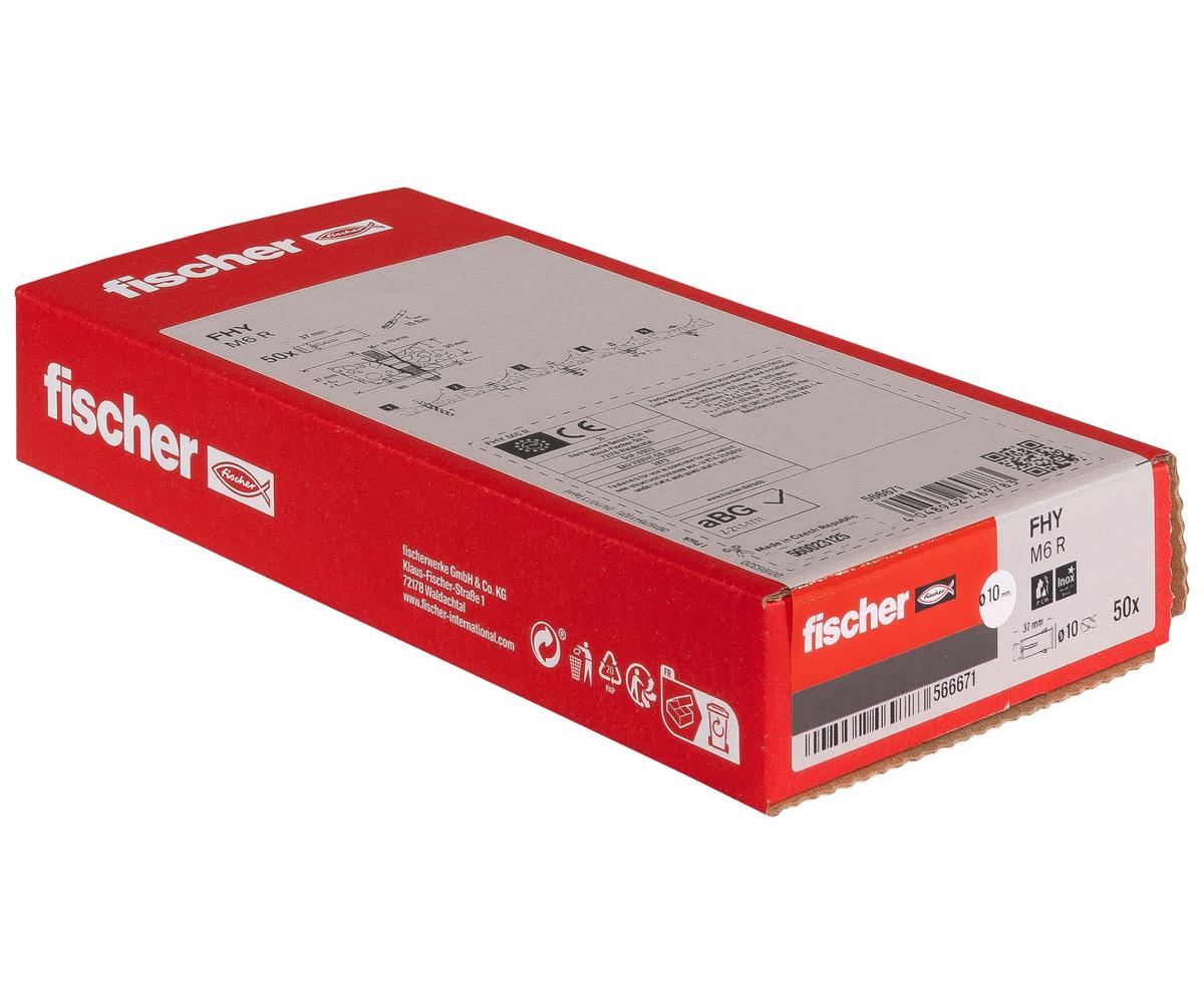Der fischer Hohldeckenanker FHY ist ein Innengewindeanker aus A4 nicht rostendem Stahl. Der FHY wird in der Durchsteckmontage mit der Hand ins Bohrloch gesetzt und mit dem Hammer bündig zur Oberfläche des Baustoffes eingetrieben. Beim Aufbringen des Drehmoments wird der Konus in die Spreizhülse gezogen. Im Hohlraum spreizt diese auf und im Vollbaustoff verspannt sich diese gegen die Bohrlochwand. Der fischer Hohldeckenanker FHY ist ideal für die Befestigung von Holz- und Stahlkonstruktionen und Konsolen in Spannbeton-Hohlplatten im Außenbereich.