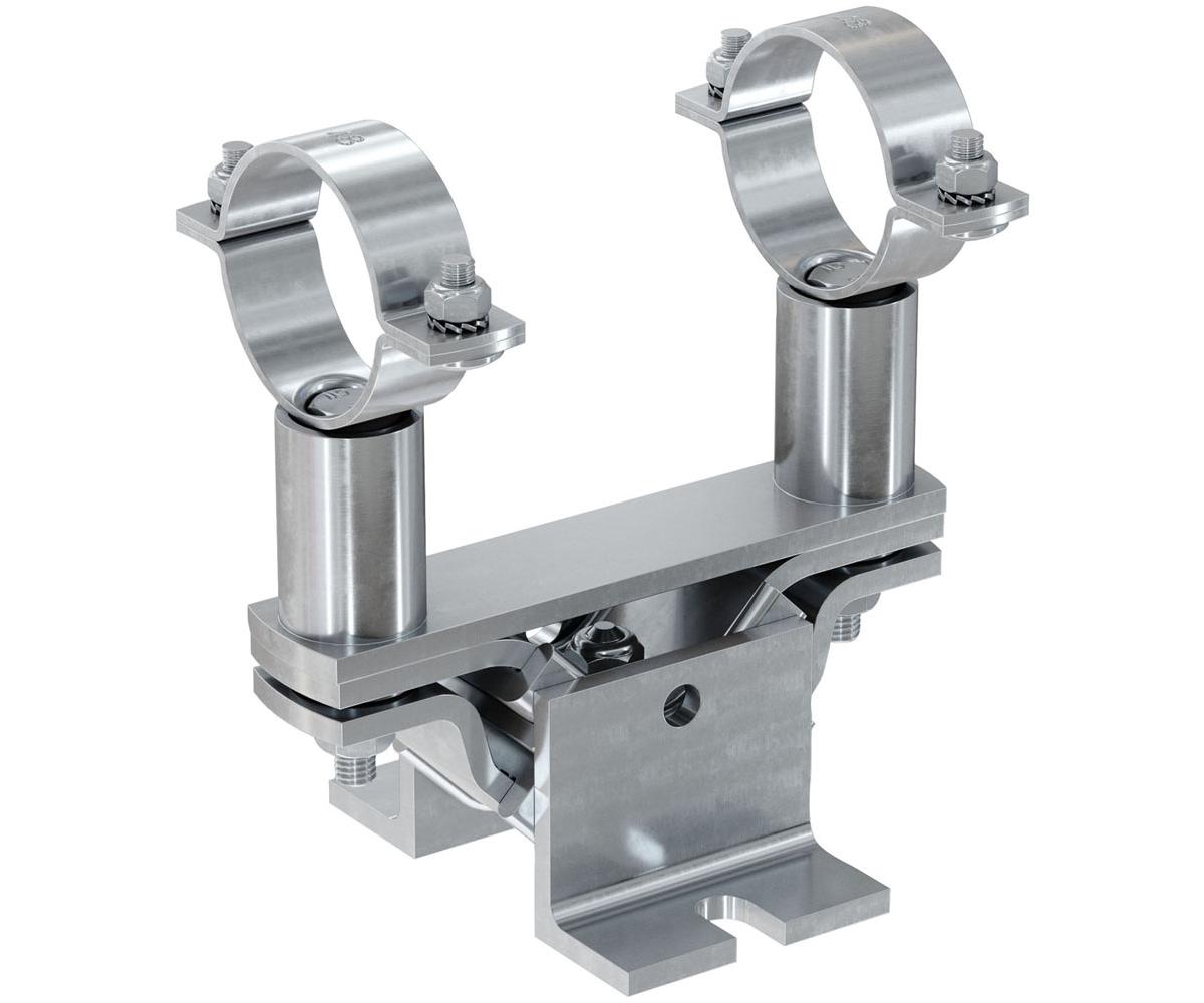 - Die kompakte Bauform des Fixpunkts ermöglicht die Aufnahme hoher Rohrlasten in jeder Einbaulage.