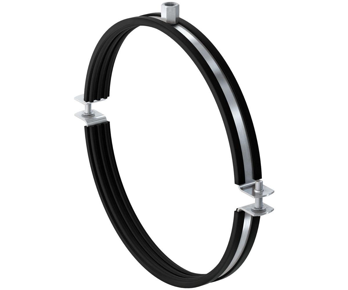 - Zweiteilige Lüftungsrohrschelle mit Schalldämmeinsatz zur Befestigung von Wickelfalzrohren