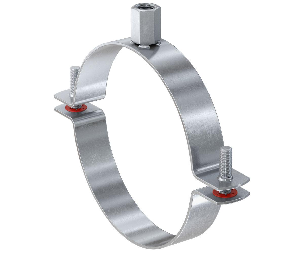 - Zweiteilige Lüftungsrohrschelle ohne Schalldämmeinlage zur Befestigung von Wickelfalzrohren