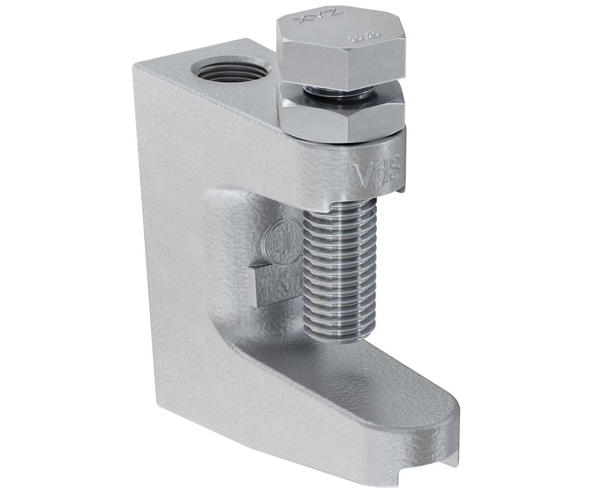 Die fischer Trägerklammer mit Durchgangsbohrung für ein einfaches Befestigen durch Klemmen an Stahlträgern. Für VdS-Anlagen sind ab DN 65 Sicherungslaschen erforderlich. Der Hohlschliff der Befestigungsschraube verhindert wirksam das Abrutschen vom Stahlträger.