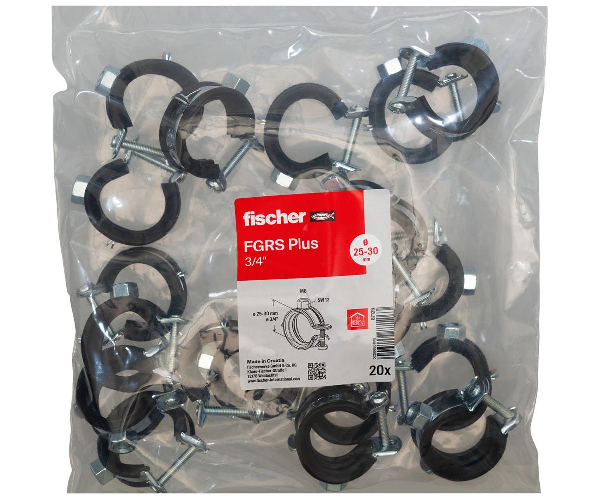 Die fischer Gelenkrohrschelle FGRS Plus ist eine Rohrschelle mit einer Schraube aus galvanisch verzinktem Stahl der Werkstoffgüte DD11 mit Kombi-Anschlussgewinde M 8 / M 10. Der Schnellverschluss und das Kombi-Anschlussgewinde ermöglichen eine einfache und zeitsparende Montage. Das Einrasten des Sicherheitsverschlusses garantiert die sichere Justage des Rohres ohne ein Aufspringen der Schelle. Damit können Rohrleitungen mit einem Außendurchmesser von 12 - 63 mm mit Gewindestange oder Stockschraube sicher im Innenbereich befestigt werden. Die Rohrschelle entspricht mit einer chlor- und silikonfreien Schalldämmeinlage den Anforderungen der DIN 4109.