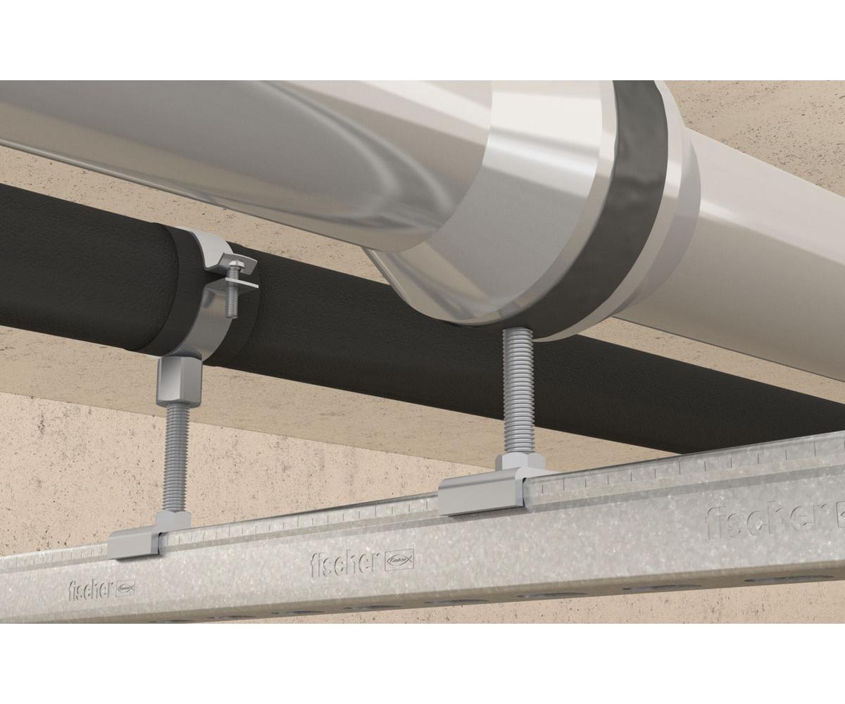 Die fischer Kälteschelle FRSK mit integrierter Spannbereichsanpassung ist eine zweischraubige Rohrschelle mit Schnellverschluss und Kombi-Anschlussgewinden M8/M10 oder M12/M16. Die Ausführung mit zwei Schrauben unterstützt die optimierte Anpassung an den Rohraußendurchmesser. Die Zweischraubigkeit und das Kombi-Anschlussgewinde erhöht die Flexibilität in der Montage. Damit können Rohrleitungen für die Kälte- und Klimatechnik mit einem Außendurchmesser von 10 - 219 mm und einer Dämmdicke von 13 oder 19 mm installiert werden.