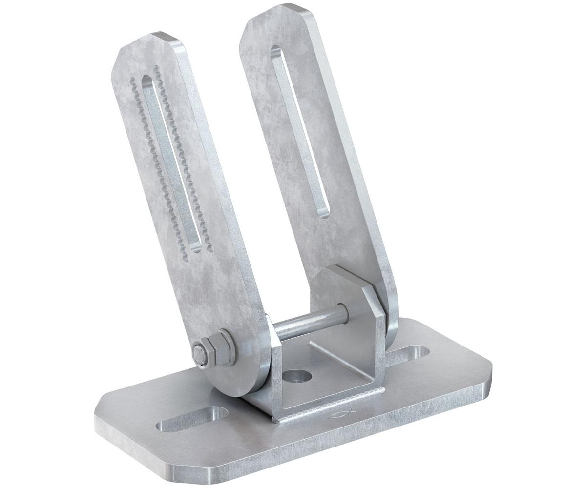 - Die Ausführung des variablen Verbinders FMVB P mit Langlöchern und Rasterung zur Aufnahme der Zahnplatte des Hammerkopf-Steckverbinders FMHB ermöglicht eine optimale Justage des abgestützten Profils für eine einfache und sichere Montage.