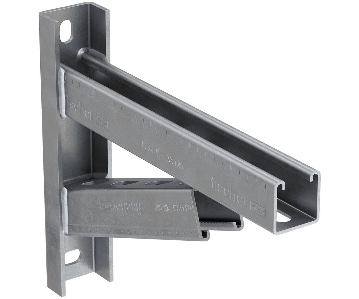 Die massive fischer Auslegerkonsole FCAM ermöglicht die schnelle und einfache Montage von Rohrtrassen entland der Wand. Einfache Ausrichtung der Konsole durch Langlöcher in der Grundplatte, die um 90° zu einander gedreht sind.
