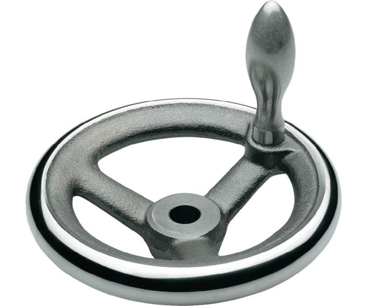 Handräder DIN 950 werden in der Gusseisen-Ausführung mit Ballengriffen aus Stahl versehen · Gusseisen GG · Nabe bearbeitet · Radkranz gedreht und poliert · Rundlauf- und Planlaufabweichung des Radkranzes < 0,4
