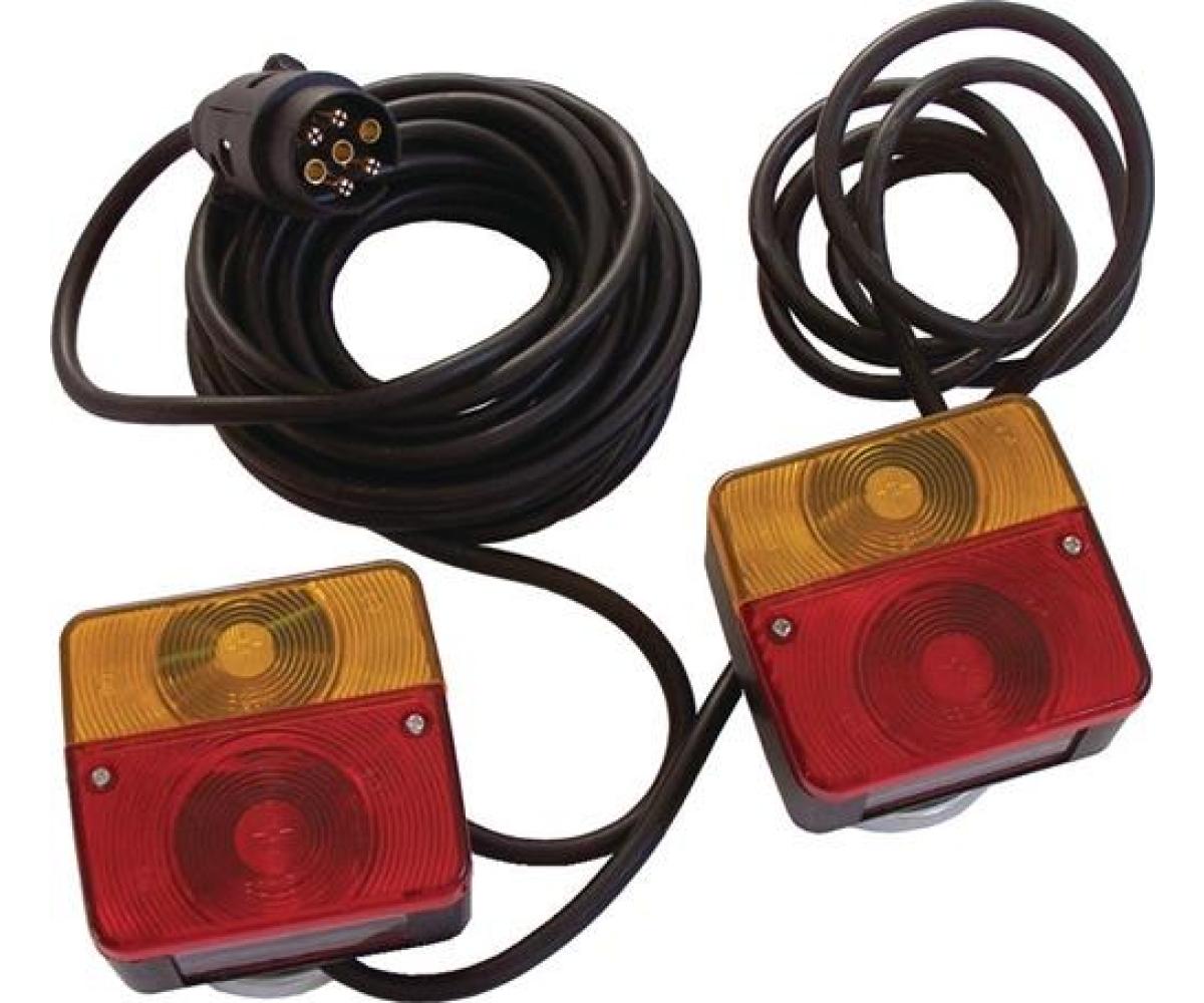 Anschlusskabel 7,5 m, Kabellänge zwischen den Leuchten 2,5 m, mit 7-poligem Stecker, 2 x 3-Kammern Anhängerleuchten mit Kennzeichenleuchte · mit Leuchtmittel 1 x 21W, 1 x 21/5W · Befestigung mittels Magneten · SB verpackt