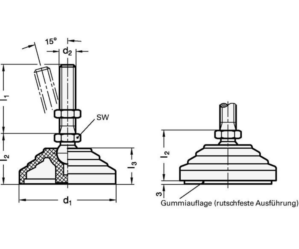 mit Mutter, mit Gummiauflage · die in der Tabelle angegebenen Werte der statischen Belastbarkeit sind Richtwerte, bei deren Überschreitung es zur bleibenden Verformung bzw. zum Bruch des Kunststofftellers kommen kann · Ausführung: Fuß Kunststoff Thermoplast (Polyamid PA), glasfaserverstärkt, schwarz, matt, temperaturbeständig bis 100 °C · Verstellspindel Stahl verzinkt, blau passiviert · Festigkeitsklasse 5.8 · Sechskantmutter ISO 4032: Stahl verzinkt, blau passiviert · Gummiauflage (NBR): 70 Shore A, schwarz