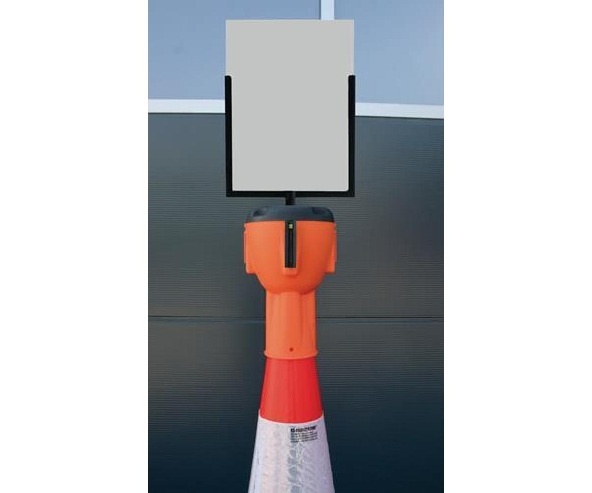 Zubehör zu Leitkegelaufsatz · U-förmiger Metallrahmen mit doppelwandigem Plexi-Einschub · DIN A4 Hochformat · zur Einbringung individueller Botschaften oder Werbung · Anbringung per Verschraubung