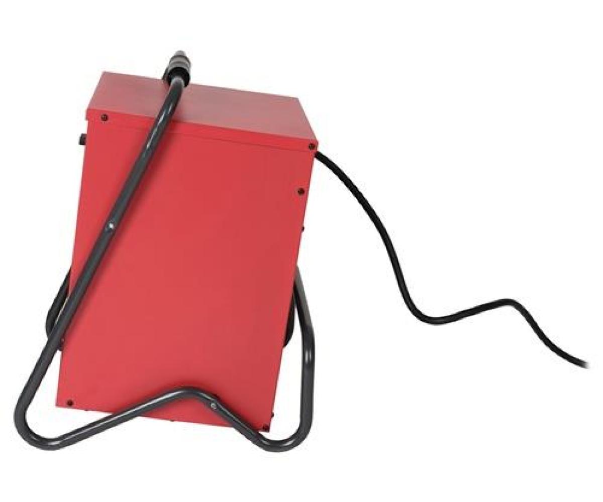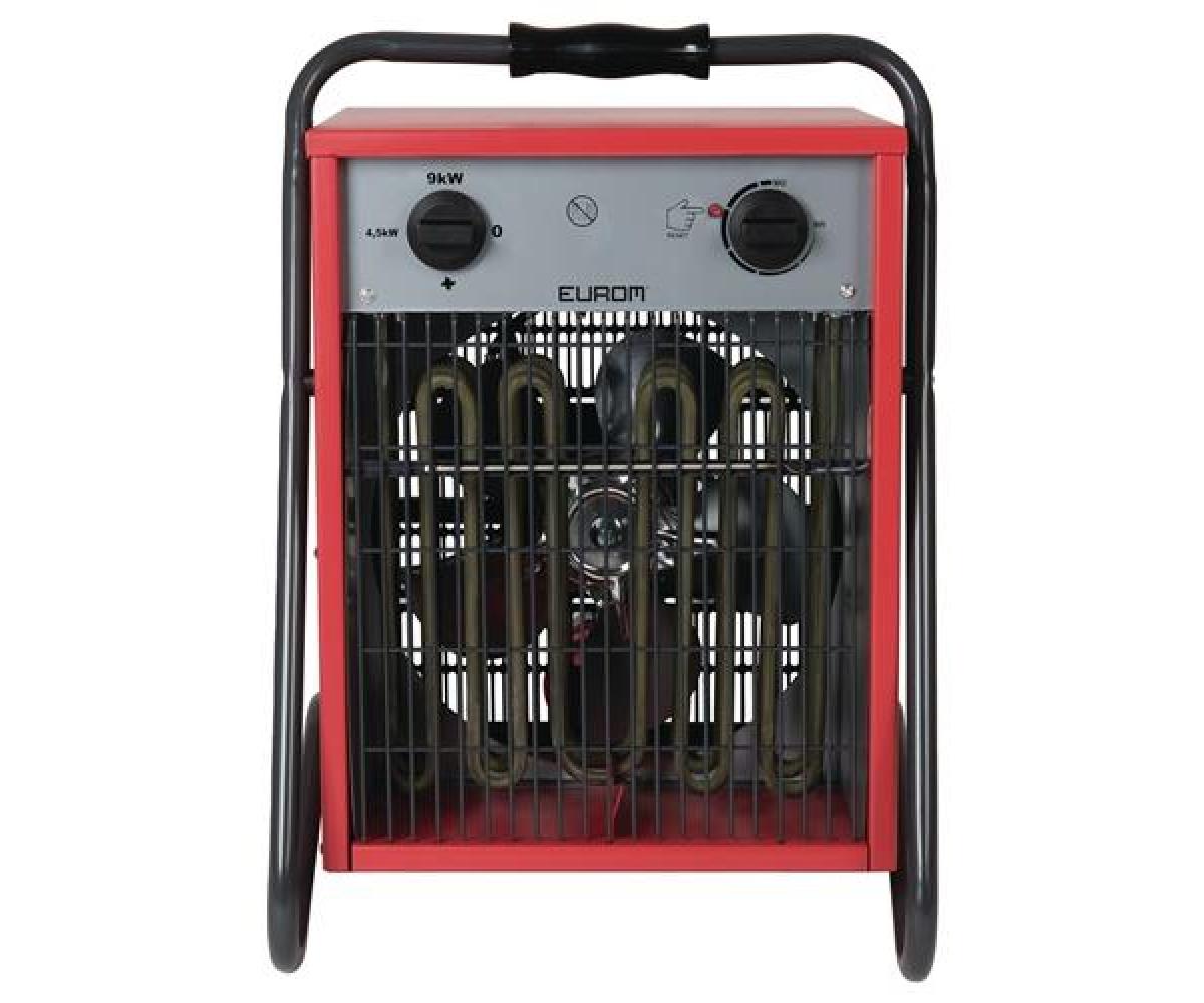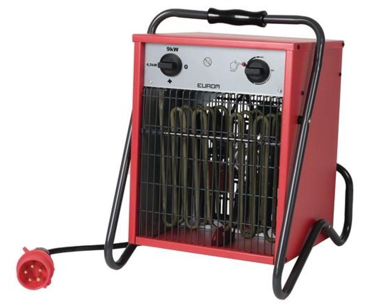 elektrische 400-V-Heizlüfterheizung · für den Einsatz in Werkstätten, Schuppen und Garagen · 9000 Watt · mit Kaltluftventilator und Thermostat · spritzwassergeschützt · robustes Metallgehäuse · Überhitzungsschutz · mit Nachkühlfunktion