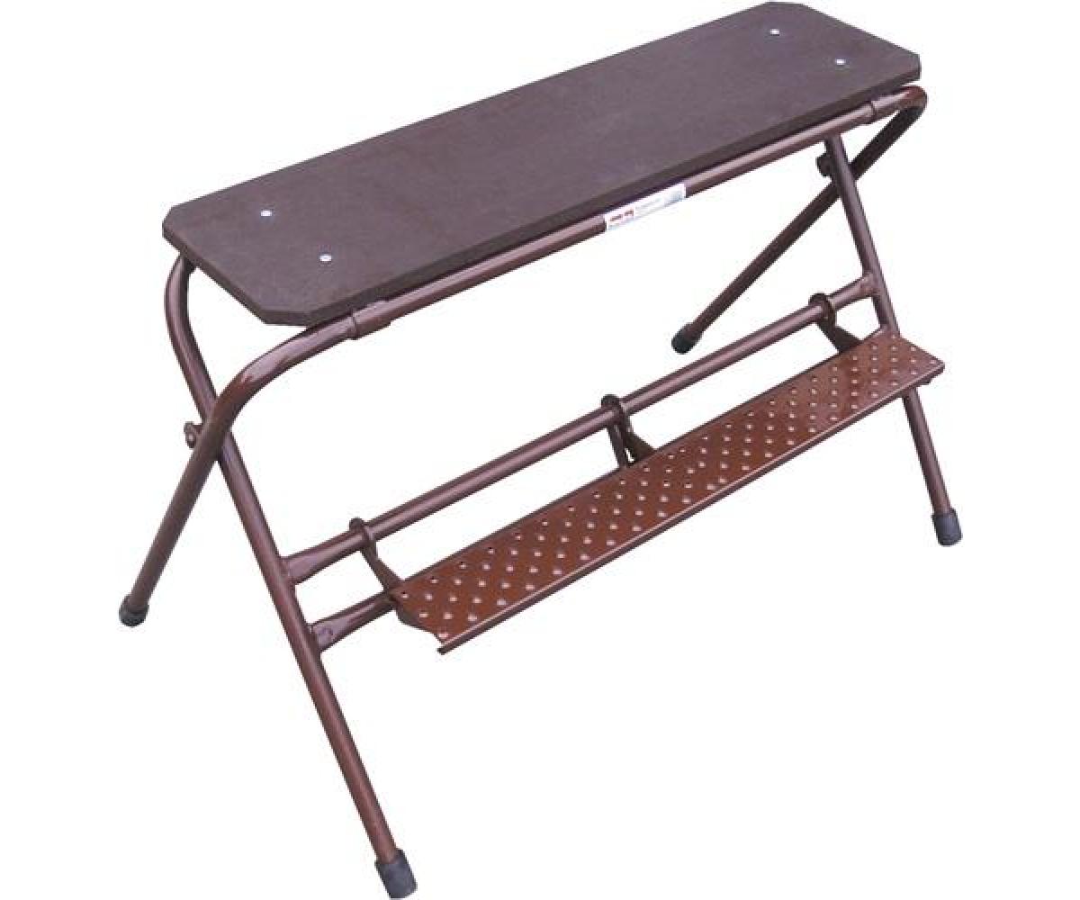 standfest · zusammenklappbar · Aufstandsfläche aus wasserfest verleimtem Mehrschichtenholz · Stufenbelag aus rutschfestem Stahl-Lochblech