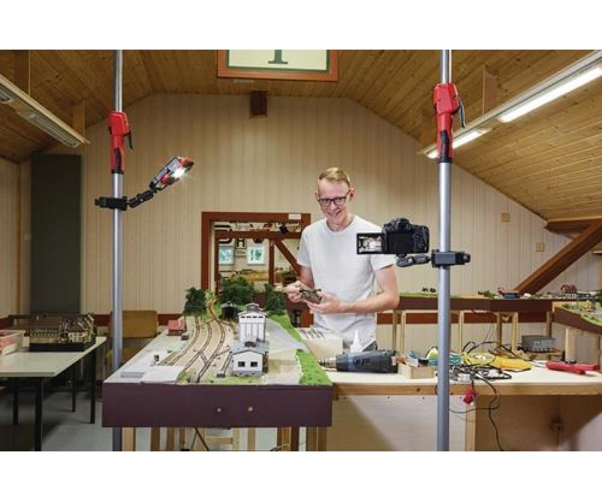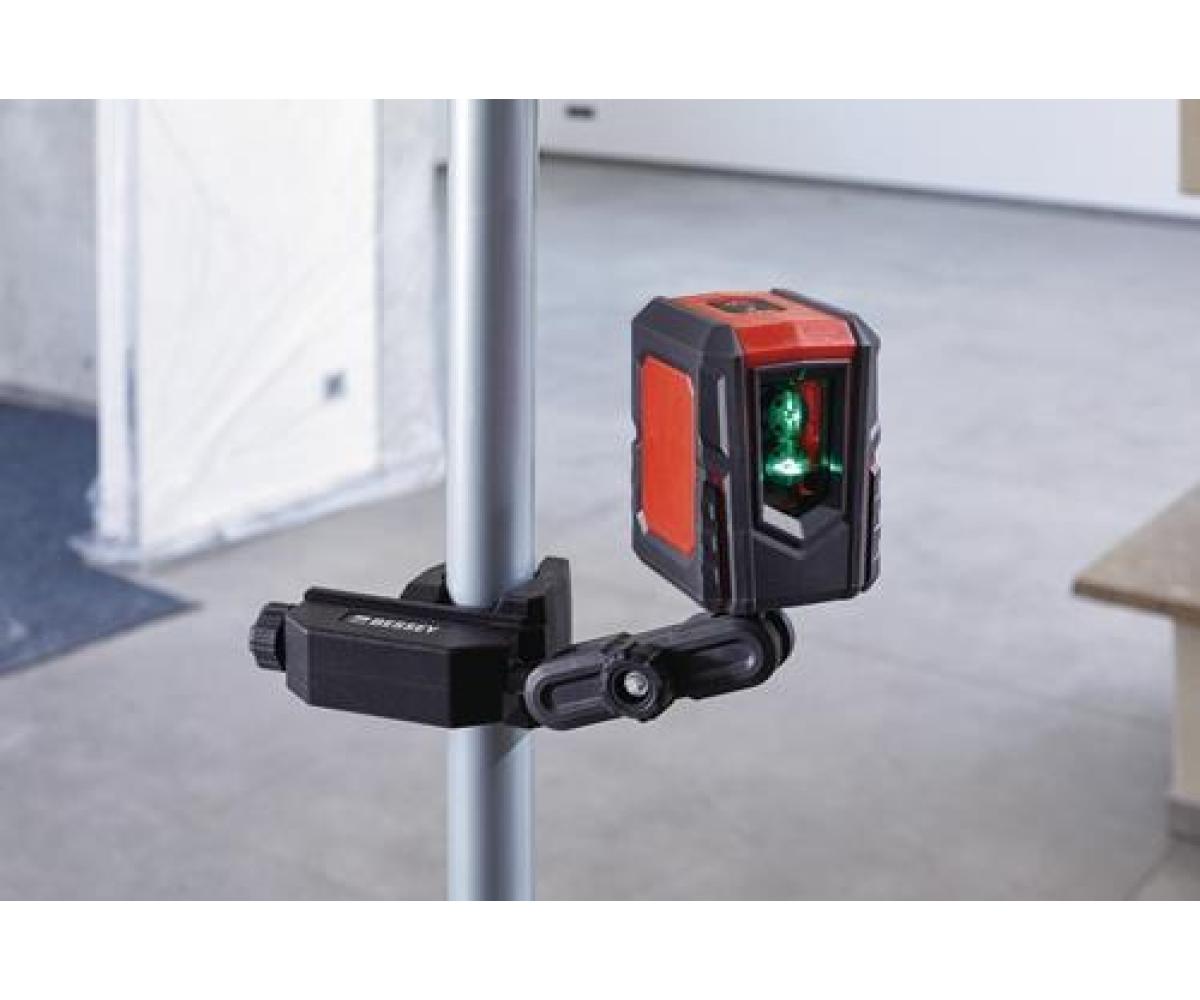 Halterung mit 1/4? Gewindeaufnahme zum Fixieren von Hilfsmitteln wie z.B. Laser · Kamera · Bauleuchte Werkzeuglos einsetzbar an runden (0-45 mm) sowie eckigen (0-55 mm) Trägerteilen wie z.B. Decken- und Montagestützen · Profilen · Leitern L-Drehhalterung mit zwei Rotationsachsen: 360° neben Befestigungsklemme · 180° an Gewindeaufnahme SB-verpackt