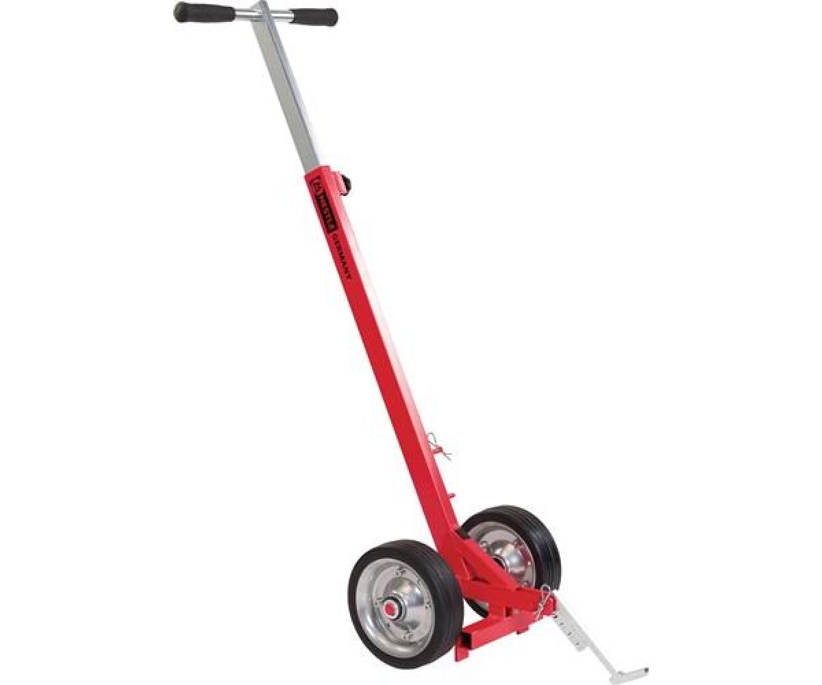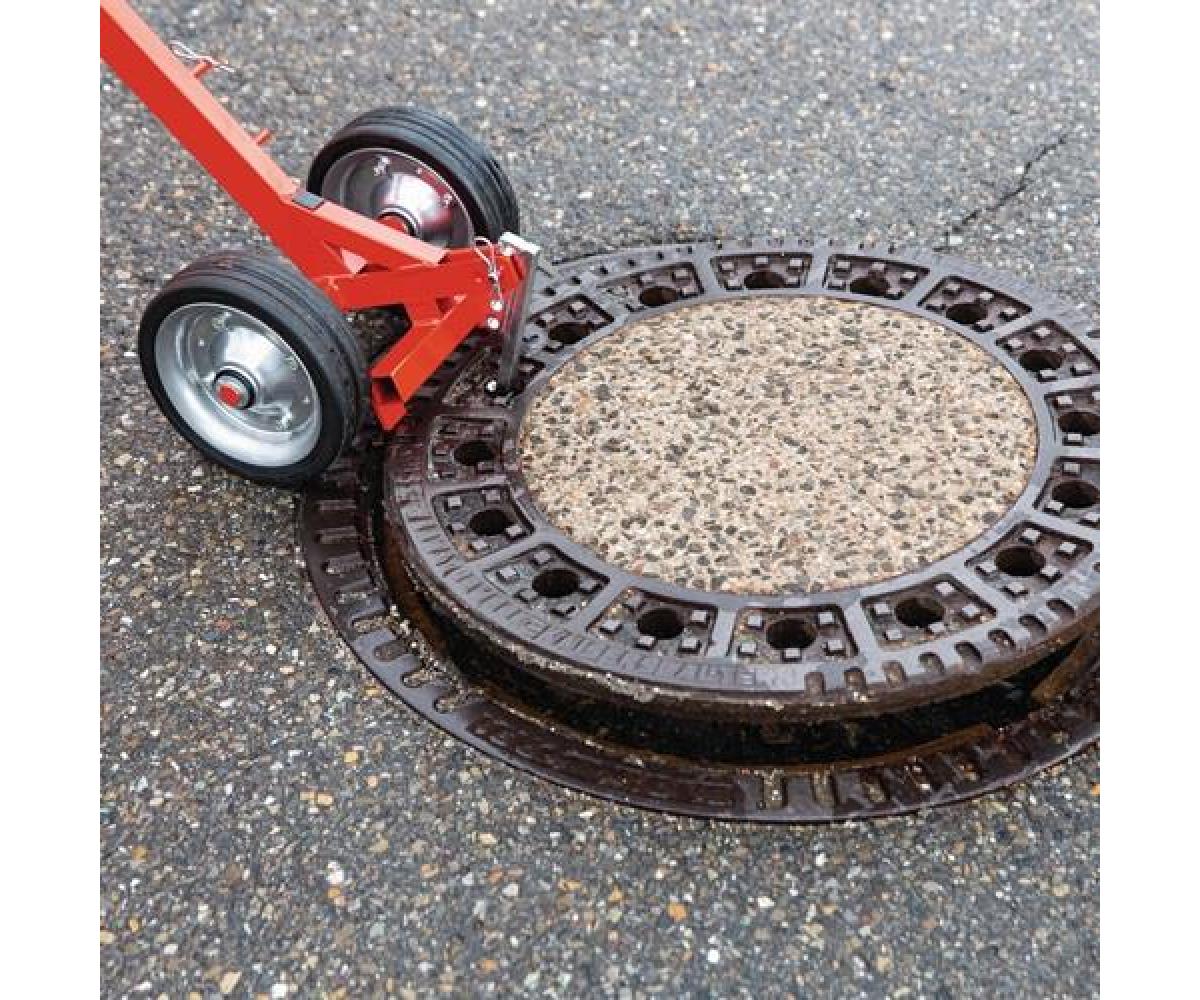 zum Anheben von Kanaldeckeln · einfache Anpassung an die Körpergröße durch die Teleskopführungsstange · Farbe: rot pulverbeschichtet · Gewicht 9 kg · Vollgummi-Schwerlasträder
