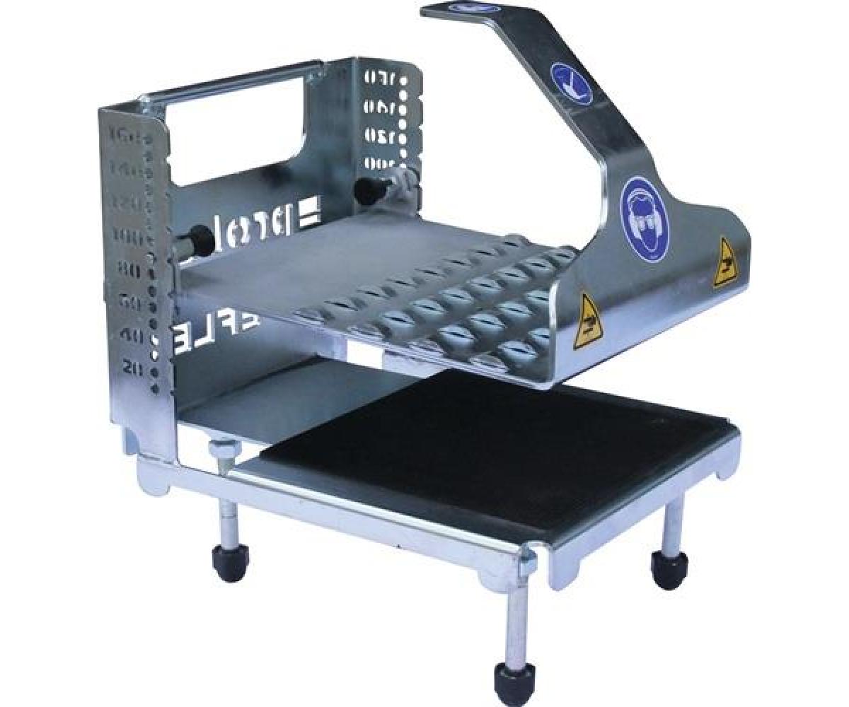 zum sicheren Trennen von Steinen · Verminderung von Schnittverletzungen · Fixierung von Baustoffen wie z.B. Pflastersteinen und Natursteinplatten · einfaches, sicheres und präzises Arbeiten mit dem Winkelschleifer · zur Fixierung des Baustoffes drückt der Anwender seinen Fuß auf das obere Spannelement · Lieferung inkl. 4 Schrauben M12 x 90 und 4 Sechskantmuttern M12