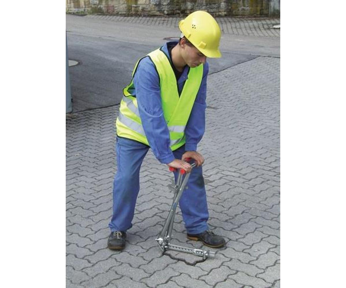 über die Arretiervorrichtung wird die Klemmwirkung ohne Aufwand aufrecht erhalten · für das schnelle Herausziehen von nicht eingesandeten Steinen lässt sich die Arretierungsvorrichtung deaktivieren · universell für alle Steinformen und Größen · leicht austauschbare profilierte Spezialmesser aus Federstahl, optimale Hebelübersetzung und Anordnung der Handgriffe · durch Einschlagen der profilierten Spezialmesser in die Fugen ist es möglich, auch bereits vor längerer Zeit verlegte Verbundsteine einzeln aus dem Verband herauszuziehen · galvanisch verzinkt