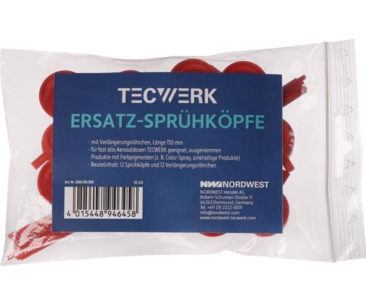 mit Verlängerungsröhrchen · passend für fast alle Aerosoldosen TECWERK – nicht geeignet für Produkte mit Farbpigmenten (Colorspray, Markierspray, Kupferspray etc.), zinkhaltige Produkte (Zink-Spray, Zink-Alu-Spray etc.) und Sprühkleber, da Sprühkopf sehr schnell verstopft/verklebt · Beutelinhalt: je 12 Sprühköpfe und Verlängerungsröhrchen (Länge 150 mm)