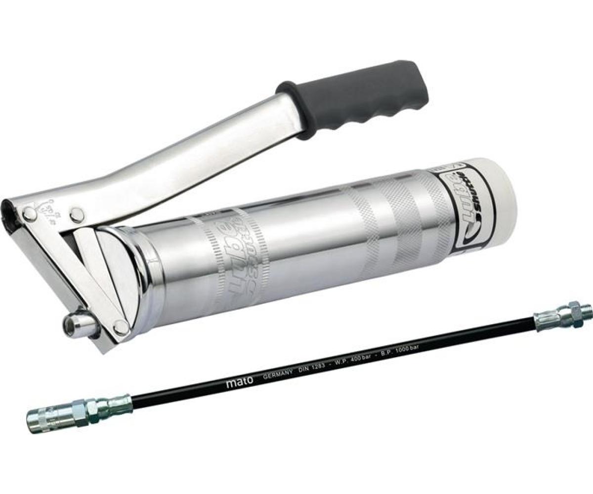 für 400g Schraubkartusche MATO Lube-Shuttle® Art.-Nr. 4000 356 161 · mit verzinktem Fettbehälter · ergonomischer Handgriff · verpackt im umweltfreundlichen Display-Karton · TÜV SÜD München Nr. Z1A100719345006-GS geprüft · einfaches, schnelles und absolut sauberes Laden und Entnehmen der Fettkartusche, ohne Öffnen der Presse · permanente Kontrolle über Füllstand und Fettsorte von aussen · optimale Restentleerung der Kartuschen · absolut umweltfreundlich · kein Entlüften nötig! · inkl. 300mm Hochdruck-Kunststoffschlauch PH-30C, M10x1 (mehrlagig, Berstdruck 1000 bar, Ø-9mm) und 4-Backen-Hydraulik-Greifmundstück · TÜV SÜD München Nr. 713061959