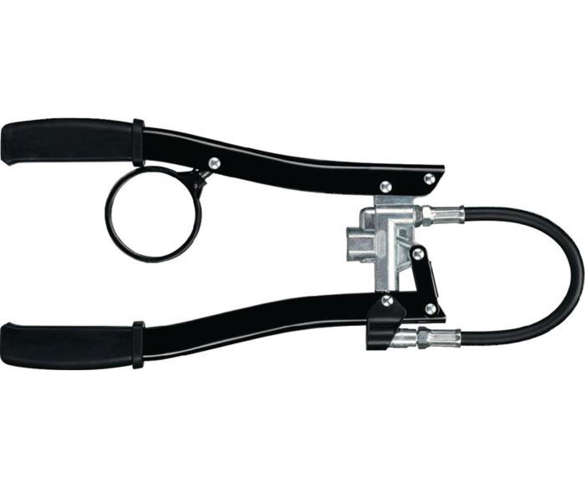 für 500-g-Schraubkartuschen · das Werkzeug für den optimalen Einsatz in Landwirtschaft, Hoch-/Tiefbau, Straßenbau für Fette bis NLGI 2 · ergonomisch geformten Handhebeln und rutschsicheren Handgriffen aus PE · der Pumpkolben (Ø 10 mm) mit hoher Passgenauigkeit zum Zylinder garantiert ein leckage-freies Arbeiten mit hohem Fördervolumen bei gleichbleíbenden Drücken · schwarz galvanisiert · Panzerschlauchhalterung am Kopf · System: 850, Pressenkopf: 1200 bar