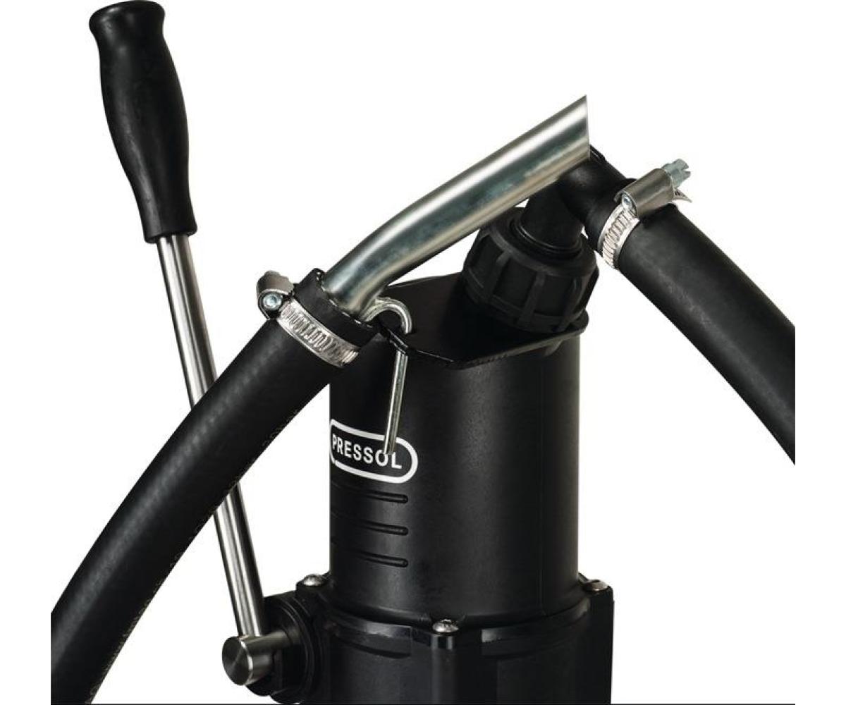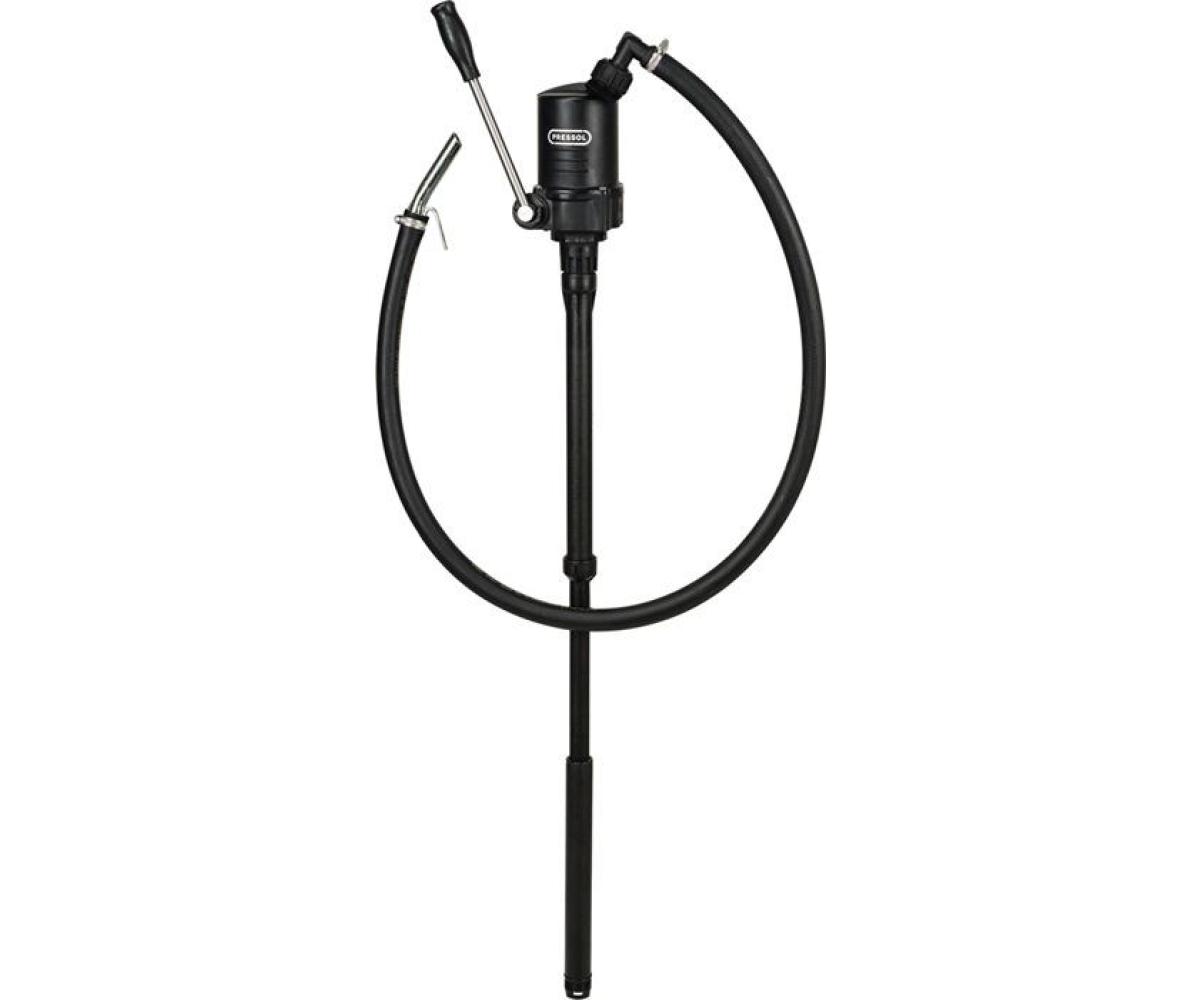 einfachste Fassmontage mittels Fassadapter und Stecksystem - im 30° Raster in 12 Positionen frei positionierbar · Pumpengehäuse mit Kolben, Handhebel und Kunststoffauslaufkrümmer · für stehende 60/200/220 l Fässer · Teleskopsaugrohr L. 355-955 mm · 2 Gewinde: M64 x 4 mm und G2? · Abgabeschlauch, 1500 mm, mit Stahlauslaufkrümmer · Schlauchhalter · für Öle bis SAE 50, Diesel, Petroleum, Kerosin, Glyzerin und Kühlerfrostschutz unverdünnt