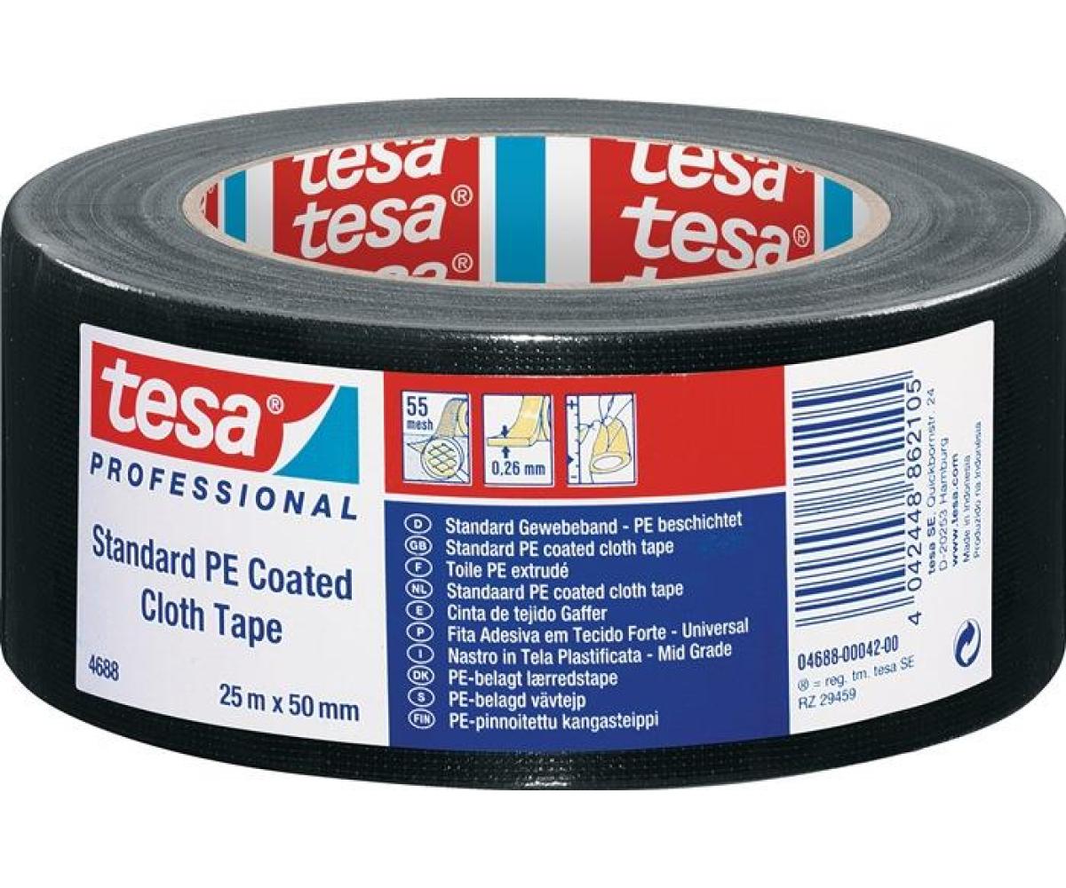 Weitere technische Eigenschaften · Trägerart: PE-extrudiertes Gewebe · Gesamtdicke: 0,26mm · Reißkraft: 52N/cm · Klebstoff: Naturkautschukkleber · Modell: 4688 · Klebkraft: 4,5N/cm · Gewebeband tesaband® · Stand.4688 schwarz L.25m · B.50mm Rl.TESA ·