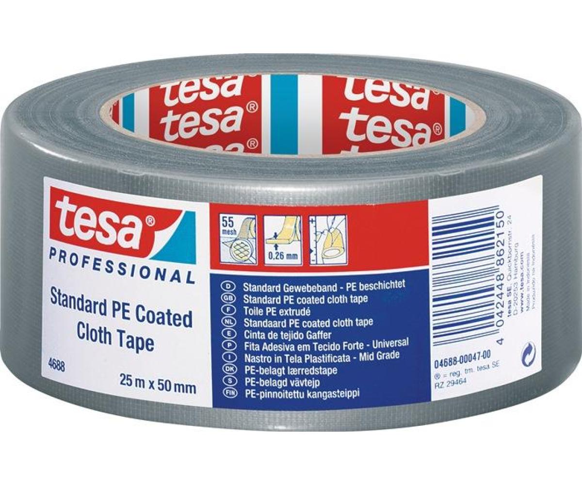 Weitere technische Eigenschaften · Trägerart: PE-extrudiertes Gewebe · Gesamtdicke: 0,26mm · Reißkraft: 52N/cm · Klebstoff: Naturkautschukkleber · Modell: 4688 · Klebkraft: 4,5N/cm · Gewebeband tesaband® · Stand.4688 silber-matt · L.25m B.50mm Rl.TESA ·
