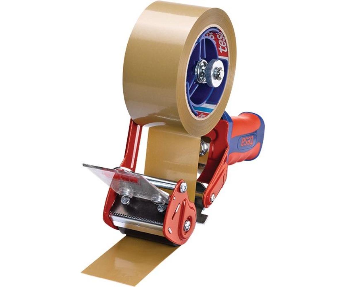 professioneller Handabroller für tesapack® · manuell verstellbare Rollenbremse · mit einziehbarer Klinge (verdecktes Messer) für eine sichere Anwendung (Verletzungsschutz) · weich-gummierter Griff für eine angenehme und sichere Handhabung · Gewicht: 500 g · Rollendurchmesser: 140 mm · Rollenkern Ø: 3 Zoll