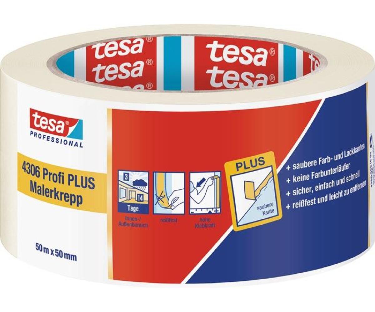 Weitere technische Eigenschaften · Farbe: hellbeige · Gesamtdicke: 0,095mm · Reißkraft: 37N/cm · Klebkraft: 2N/cm · Malerkreppband 4306 Profi · PLUS leicht gekreppt · hellbeige L.50m B.50mm ·