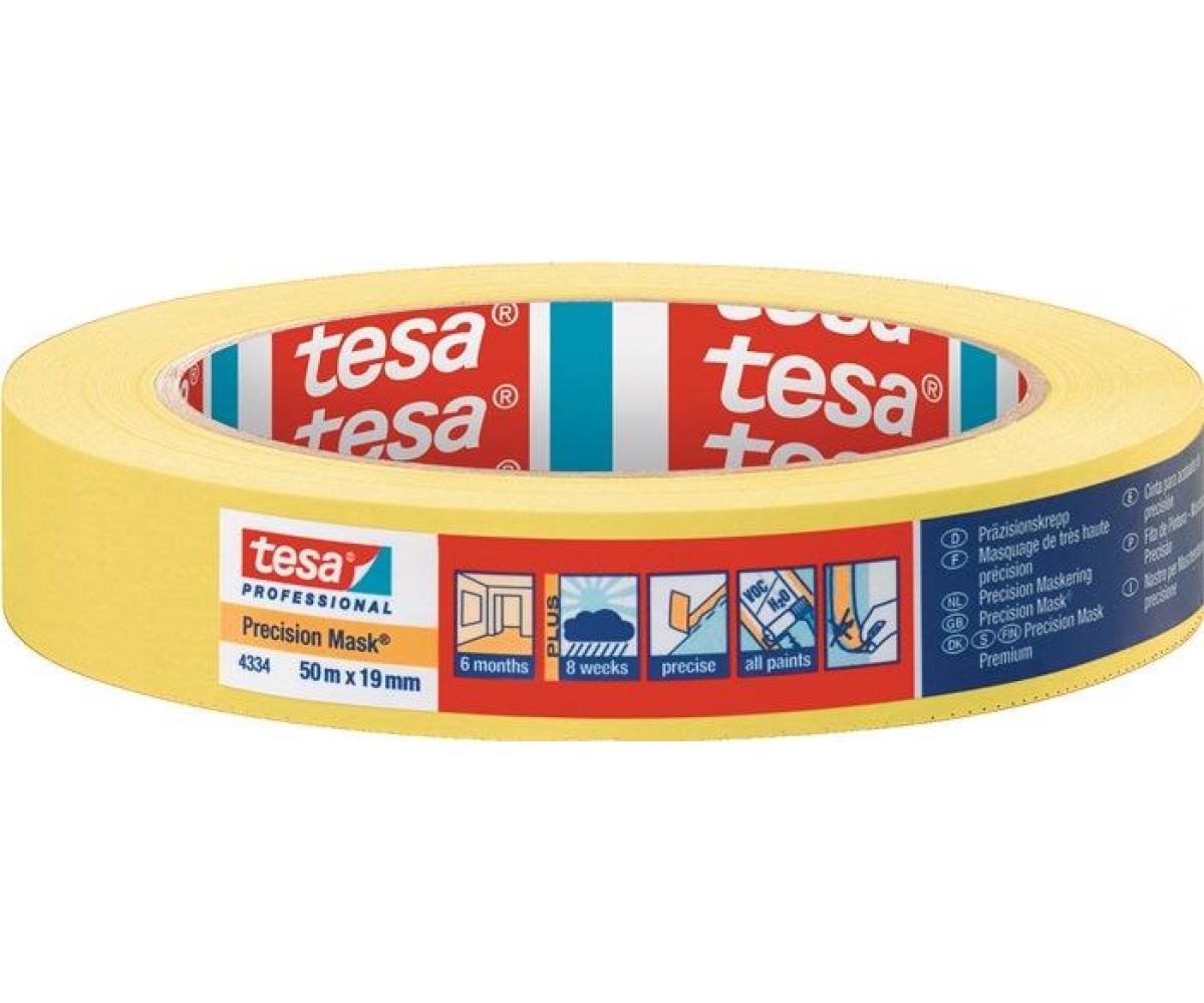Weitere technische Eigenschaften · Farbe: gelb · Gesamtdicke: 0,09mm · Reißkraft: 30N/cm · Klebkraft: 1,85N/cm · Präzisionskrepp 4334 · glatt gelb L.50m B.19mm · Rl.TESA ·