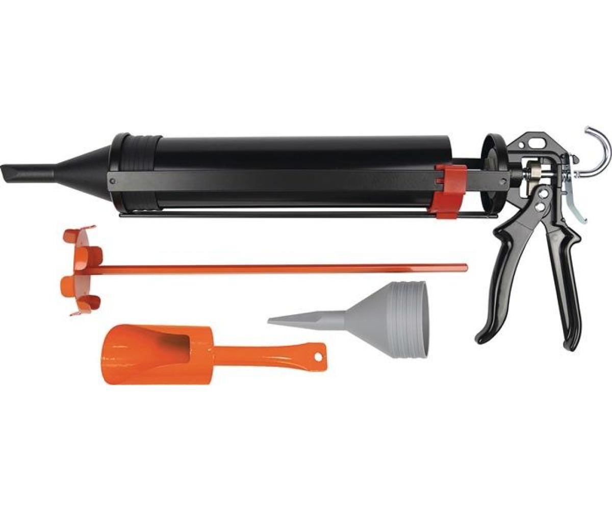 Lieferumfang: 1 Mörtelpresse X7-1000, jeweils 1 Mörtelspitze in grau und schwarz, 1 Mörtelpressenrohr, 1 Mischer, 1 Metallschaufel