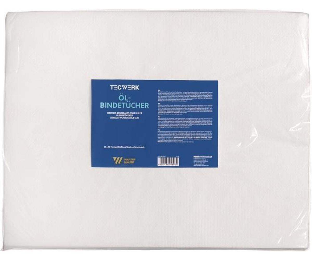 Weitere technische Eigenschaften · Gebinde: Karton · Ölbindetücher L.40cm · B.50cm S.1cm 10x10 · Tü.Krt.TECWERK CHEMICALS · Hinweis: Bindemittel nach Gebrauch nicht in den Restmüll geben, sondern unter Beachtung der behördlichen Vorschriften für die aufgenommenen Medien fachgerecht entsorgen. ·
