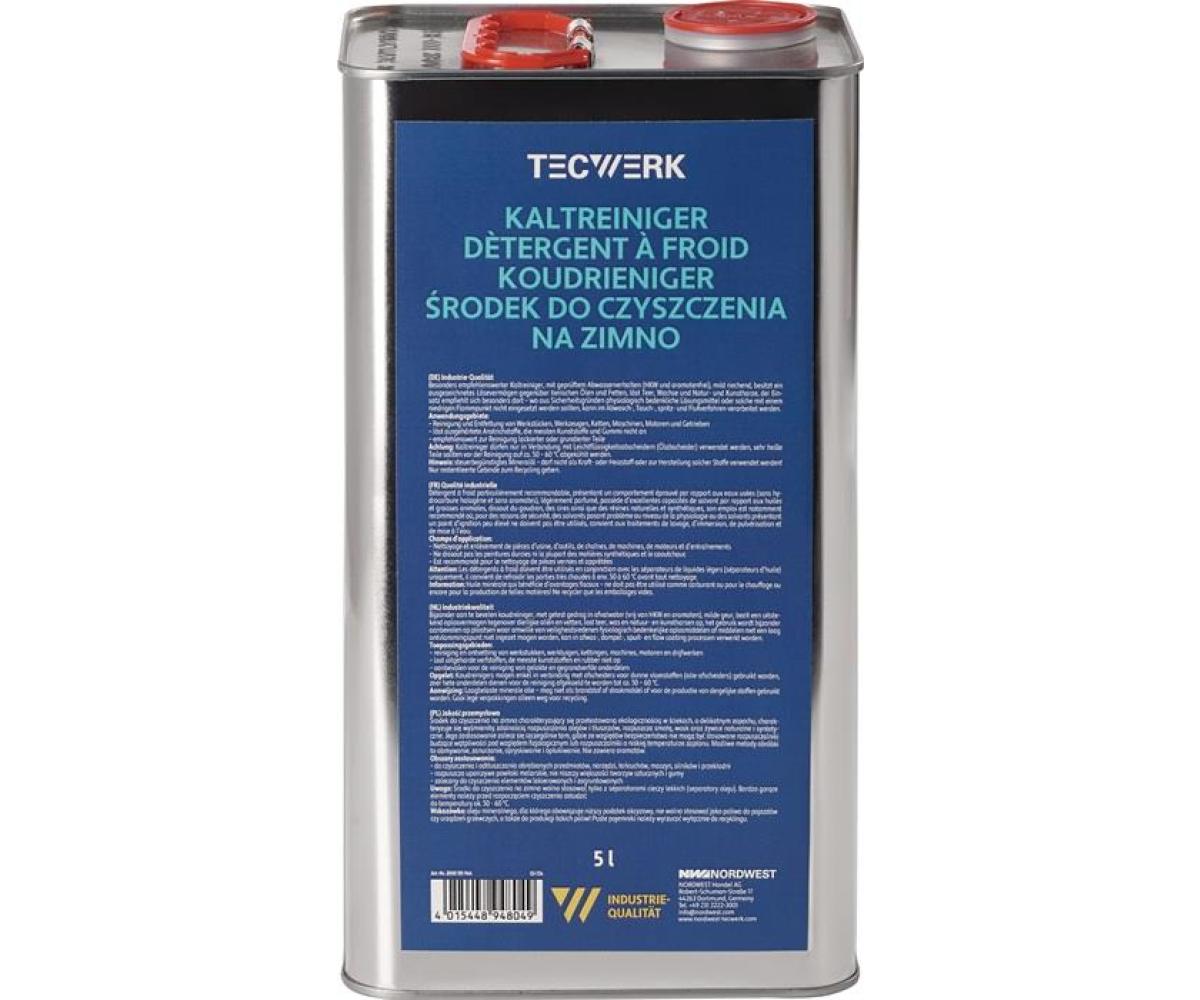 Kaltreiniger 5l Kanister · TECWERK · Kaltreiniger dürfen nur in Verbindung mit Leichtflüssigkeitsabscheidern (Ölabscheider) verwendet werden, sehr heiße Teile sollten vor der Reinigung auf ca. 50 - 60 °C abgekühlt werden! ·