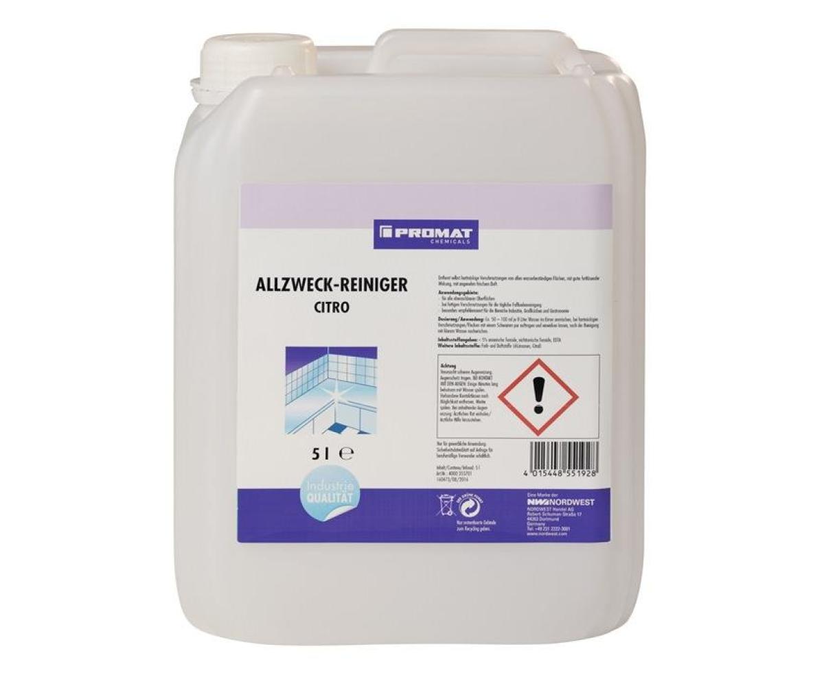 Weitere technische Eigenschaften · Gebinde: Kanister · Allzweckreiniger Citro 5l · Kanister TECWERK CHEMICALS · Dosierung: ca. 50-100 ml je 8 Liter Wasser im Eimer anmischen, bei hartnäckigen Verschmutzungen/Flecken mit einem Schwamm pur auftragen und einwirken lassen, nach der Reinigung mit klarem Wasser nachwischen ·
