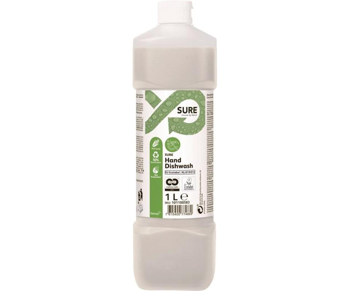 konzentriert · zur Reinigung von Töpfen, Pfannen, Geschirr, Glas und allen abwaschbaren Utensilien · reduzierte Schaumbildung · schnelles Lösen von Fett und angetrockneten Speiseresten · glänzende Oberflächen durch streifenfreies, einfaches Abspülen · duft- und farbstofffrei · zertifiziert nach EU-Ecolabel · Mischverhältnis: 0,1% bis 0,2% (5 ml - 10 ml Reiniger auf 5 Liter Wasser) SURE-Reinigungsmittel sind auf pflanzlicher Basis, zu 100% biologisch abbaubar sowie sicher in der Anwendung - keine umweltgefährdende Einstufung, keine Kennzeichnung, keine Gefährdung für Anwender