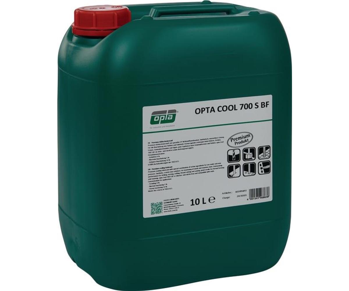 Nachfolger zu opta Cool 700 S · wassermischbarer, synthetischer Premium-Kühlschmierstoff mit spezieller EP-Wirkstoffkombination · mit guter Resistenz gegen Mikroorganismen · für die Bearbeitung von Edelstahl und allgemeinen Stahlqualitäten · hervorragende Leistungen beim Bohren, Drehen, Fräsen, Gewindeschneiden und Sägen, gute Leistungen beim Gewindeformen und Reiben · einsetzbar bei allen spangebenden Verfahren in zentral- und einzelversorgten Werkzeugmaschinen · sehr gute Schmierwirkung · guter Korrosionsschutz · schaumarm · chlor- und nitritfrei · die Anforderungen der TRGS 611 werden erfüllt ???????Einsatzkonzentration: Schleifen: 4 % Normale Bearbeitung: 5 % Schwere Bearbeitung: 10 % Hinweis: das Konzentrat immer in das vorgelegte Wasser einrühren, nie umgekehrt!