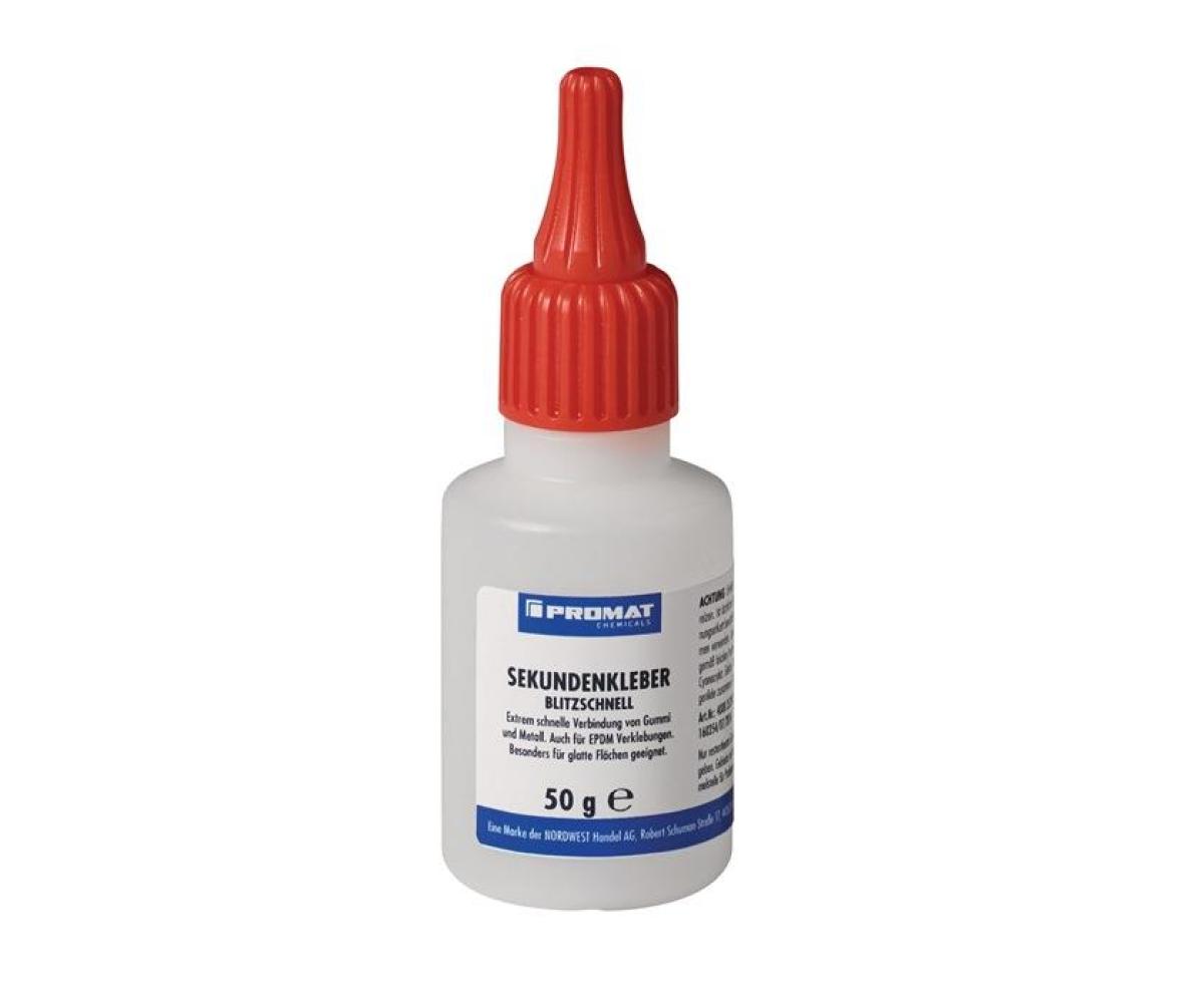 spezieller Cyanacrylatkleber · verklebt blitzschnell in nur einer Sekunde Kunststoffe und Metalle sowie deren Kombinationen · besonders geeignet für glatte Flächen · anwendbar in Elektrik- und Elektronikindustrie, Maschinenbau, Metallverarbeitung, Automobilbau, Kunststoffverarbeitung, Modellbau, Möbelindustrie u. v. a. · Viskosität: 3 bis 10 mPas (20 °C) · Spaltfüllvermögen: 0,05 mm · handfest nach: Aluminium: 5-10 Sekunden, Gummi: 2-5 Sekunden · temperaturbeständig von -50 °C bis +80 °C
