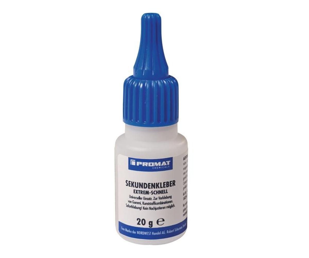Weitere technische Eigenschaften · Spaltüberbrückung max.: 0,1mm · Sekundenkleber extrem · schnell 20g farblos · Flasche PROMAT CHEMICALS ·