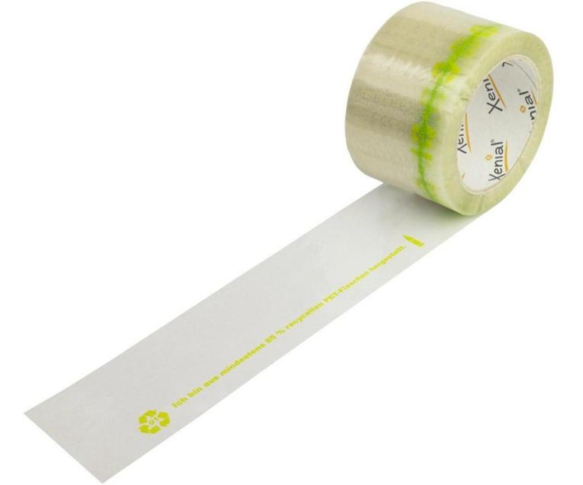Xenial PET-Recycling-Klebeband 75 mm x 100 lfm. Umweltfreundliches Klebeband mit Aufdruck Ich bin aus mindestens 85 % recycelten PET-Flaschen hergestellt zeigt dem Empfänger · dass Sie umweltbewusst agieren! Niedriger CO2-Fußabdruck Zu mindestens 85 % aus recycelten PET-Flaschen hergestellt Recyclingfähig Kern aus recyceltem Papier Zuverlässiger und dauerhafter Verschluss für mittelschwere und schwere Kartonagen über 36 kg Weniger Rollenwechsel dank 100 lfm./Rolle Sehr gute Klebkraft Lösungsmittelfreier Hotmeltkleber Gute Feuchtigkeits- und Witterungsbeständigkeit Hitzebeständig kurzfristig bis ca. +170 °C Reißkraft: mind. 40 N/cm Klebkraft: mind. 5 N/cm