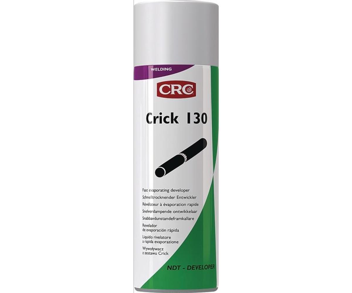 weißer Entwickler zur zerstörungsfreine Rissprüfung an Metall- und Kunststoffoberflächen · Rissprüfsystem für die Sichtprüfung schadhafter Stellen bei Schweißnähten, Tanks, Rohren, Gabelstaplern und Hebebühnen · nach Eindringverfahren gemäß DIN EN ISO 3452 · CRICK Rissprüfsystem: CRICK 110 Reiniger, CRICK 120 Rotes Eindringmittel, CRICK 130 Nassentwickler