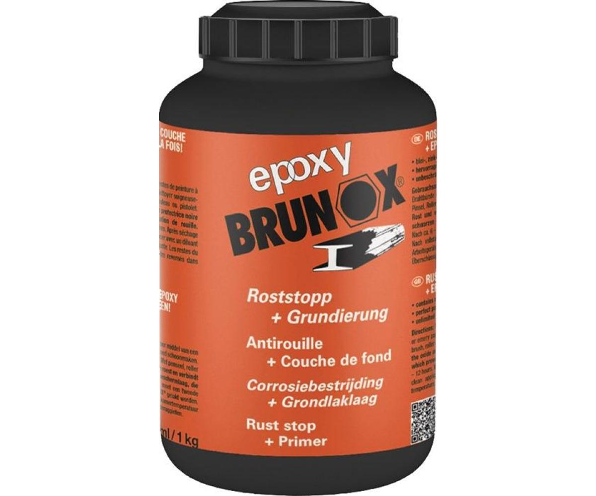 patentierter Roststopp und Grundierer mit Epoxyharzen · dringt ca. 10 x tiefer in die Rostporen ein als herkömmliche Rostumwandler Emulsionen · sehr guter Verlauf, hinterlässt keine Pinselspuren · weitgehend verträglich mit den meisten handelsüblichen Decksystemen · auch mit Airless- oder Druckluftpistolen unverdünnt zu applizieren · ohne Schwermetalle und mineralischen Säuren · kein Silikonentferner, Bremsenreiniger o.ä. nötig Rostsanierung in 3 Schritten: 1. losen Rost entfernen, Roststaub/Rostpartikel mit einem feuchten Tuch/Kompressor wegwischen/wegblasen · 2. 2x BRUNOX® epoxy® auftragen oder 3-4x per Airlessgerät/Lackierpistole · auf vollständige Trocknung prüfen (FINGERNAGELHART) – kein Abwaschen nötig · 3. Schicht trockenschleifen (nur Glanz entfernen) · Spachtelmassen, 1-K-Füller oder direkt die Endlackierung auftragen