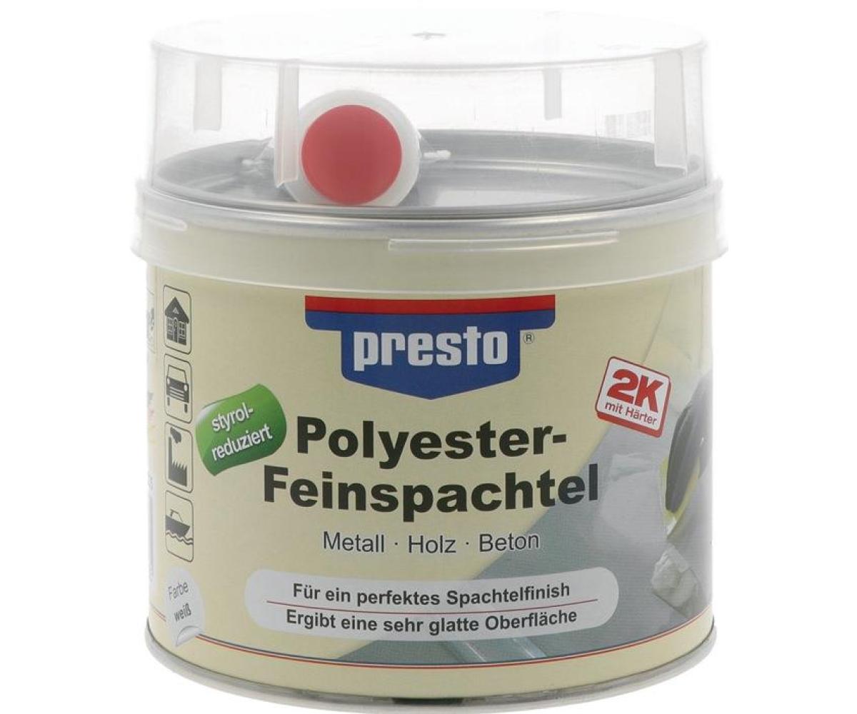 hochelastischer 2K-Polyester-Feinspachtel · zum Ausfüllen kleinerer Unebenheiten und zum dünnen „Feinspachteln“ schon vorbehandelter Flächen · universell einsetzbar im gesamten Kfz-Bereich, Maschinenbau, bei Hobby-Arbeiten auf vielen Materialien · geeignet für Untergründe aus Metall, Holz, Beton oder auf mit presto Füllspachtel vorgespachtelte Untergründen · schnelle Aushärtung · durch mikrofeine Füllstoffe erhält man eine sehr glatte Oberfläche