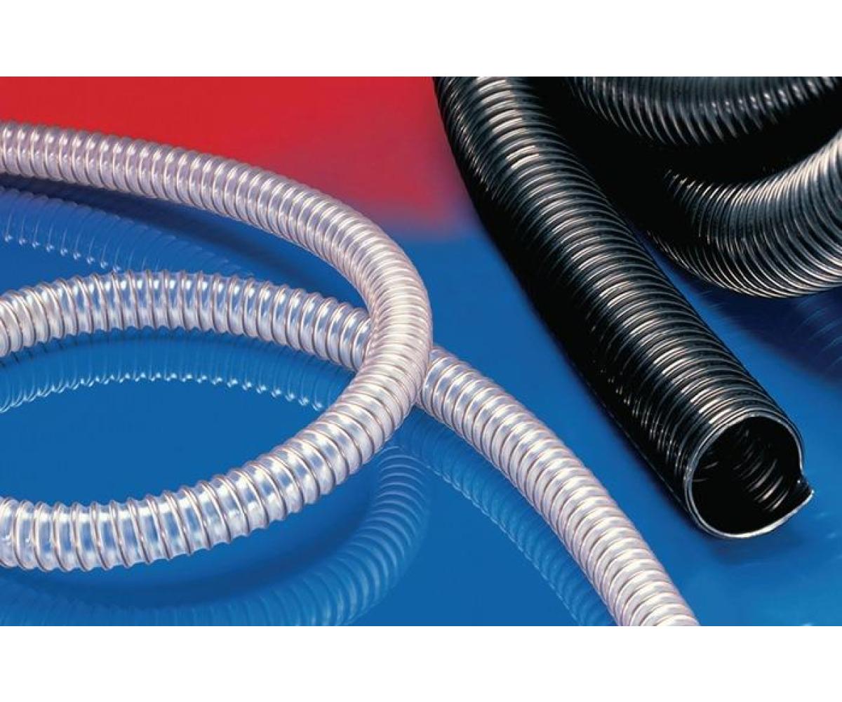 Anwendungen: flexibler Schlauch für hohen Durchsatz an warmem und abrasivem Pulver, Schüttgut, Granulat und für warme Gase, Kunststoffindustrie, Förderung von Granulaten und Pulver: Granulatfördergerät, Vakuumförderer, Saugförderer, Dosiersystem, Big-Bag Befüllung und Entleerung, Schredder, Mühle, Extruder, Spritzgußmaschine, Folienblasanlage, Kühlluft am Extrusionswerkzeug, Offsetdruckmaschine: Luftversorgung, Luftversorgungsschrank, Textilindustrie, Dampfabsaugung: Dampfbügeleisen, Dampfbügelautomat, Bügelpresse, Rohstoff Förderschlauch für Pulver, Granulate, Sand, Quarz, Kies, Scherben und Späne, Verdichter/ Kompressor, Seitenkanalverdichter, Vakuumpumpe, Druckpumpe, Pumpe Eigenschaften: schwere Ausführung, hoch abriebfest, sehr gut hitzebeständig (besser als vergleichbares TPE und Neopren), erhöhte Druck- und Vakuumfestigkeit, gute Öl-, Benzin- und Chemikalienbeständigkeit, sehr gute Kälteflexibilität, gemäß DIN 26057 Typ 3, RoHS konform, REACH konform Konstruktion: 1. in der Wandung fest eingegossener Federstahldraht, 2. Wandung: patentiertes spezial Premium Hochtemperatur-Polyurethan HT-PUR (Pre-PUR ® ), 3. Wandstärke ca. 1,4 - 1,5mm Temperaturbereich: -40 °C bis 125 °C, kurzzeitig bis 150 °C Liefervarianten: weitere Ausführungen, Abmessungen und Längen auf Anfrage lieferbar