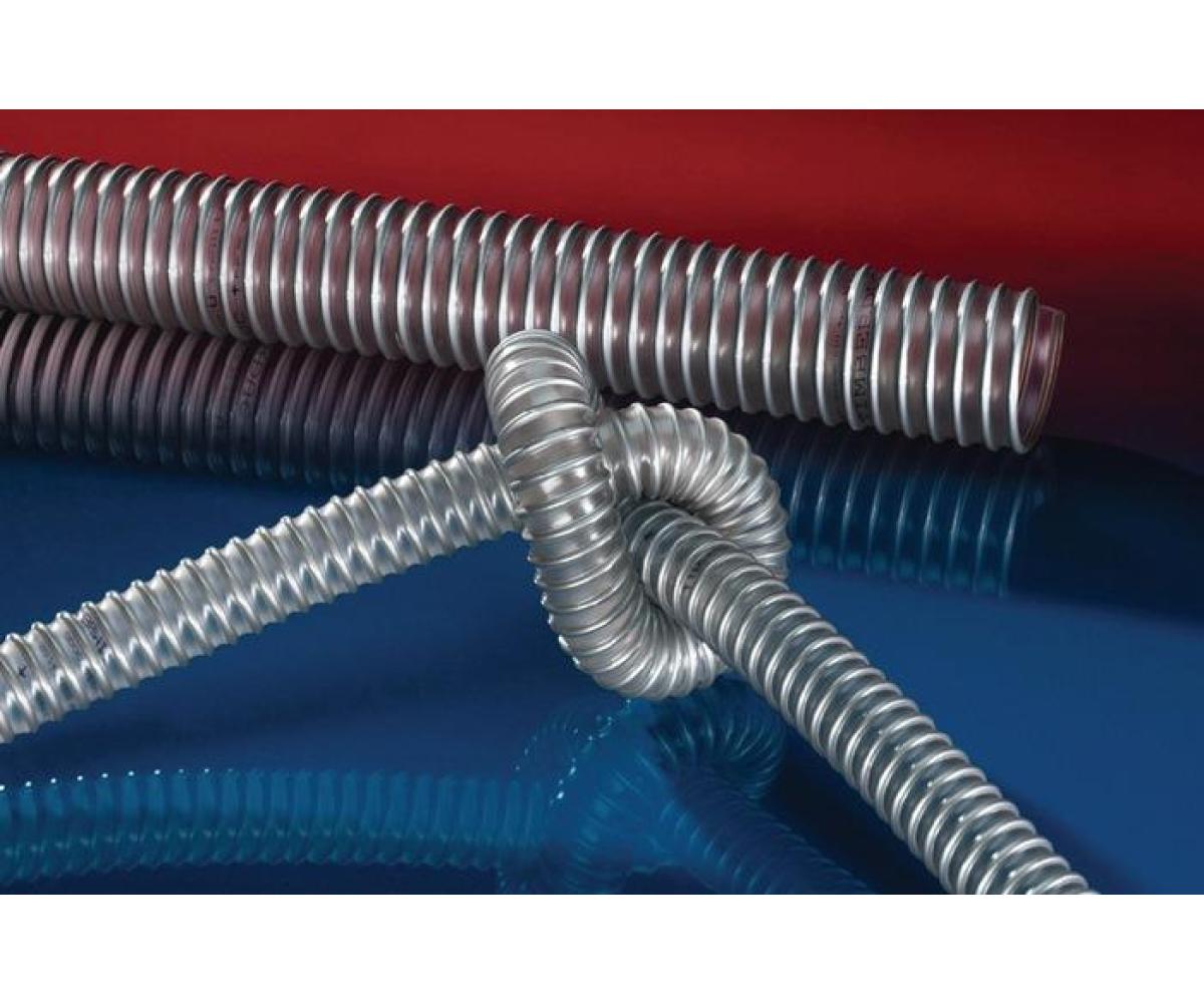Anwendungen: Absauganlage, Entstaubungsanlage, Filteranlage, Ölnebelabsaugung, explosionsgefährdeter Bereich, Holzstaubabsaugung, Holzspäne: Holzindustrie, Möbelproduktion, Sägewerk, Holzstaubabsaugung: Plattensäge, Säge, Holzbearbeitungsmaschine, Kantenbearbeitungsmaschine, Parkettschleifmaschine Eigenschaften: schwere Ausführung, hoch abriebfest, erhöhte Druck- und Vakuumfestigkeit, mikrobenfest, gute Öl-, Benzin- und Chemikalienbeständigkeit, schwerentflammbar nach: DIN 4102-B1, Wandung permanent antistatisch: Durchgangswiderstand und Oberflächenwiderstand Konstruktion: 1. in der Wandung fest eingegossener Federstahldraht, 2. Wandung: gegen aggressive Hölzer und Holzschutzmittel beständiges, permanent-antistatisches Premium Polyurethan (Pre-PUR ® ), 3. Wandstärke ca. 0,7 mm Temperaturbereich: -40 °C bis 90 °C, kurzzeitig bis 125 °C Liefervarianten: weitere Ausführungen, Abmessungen und Längen auf Anfrage lieferbar