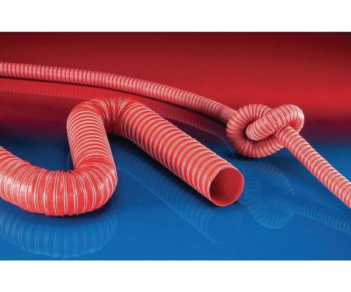 Anwendungen: flexibler Schlauch für heiße und kalte Gase, Granulattrockner/ Kunststofftrockner, Heißlufttrockner, Folienblasanlage, Kühlluft am Extrusionswerkzeug, Kühlluft: UV Trockner, IR/Infrarot Trockner, Reinraumbelüftung, Halbleiterfertigungsmaschine Eigenschaften: fadenverstärkt, sehr gut hitzebeständig, RoHS konform Konstruktion: 1. in der Wandung eingebetteter Federstahldraht, 2. gewebeverstärktes Band, Wandung: Silikon beschichtetes Glasgewebe, 3. Kordel als Verstärkung Temperaturbereich: -70°C bis 260°C, kurzzeitig bis 280°C Liefervarianten: weitere Ausführungen, Abmessungen und Längen auf Anfrage lieferbar