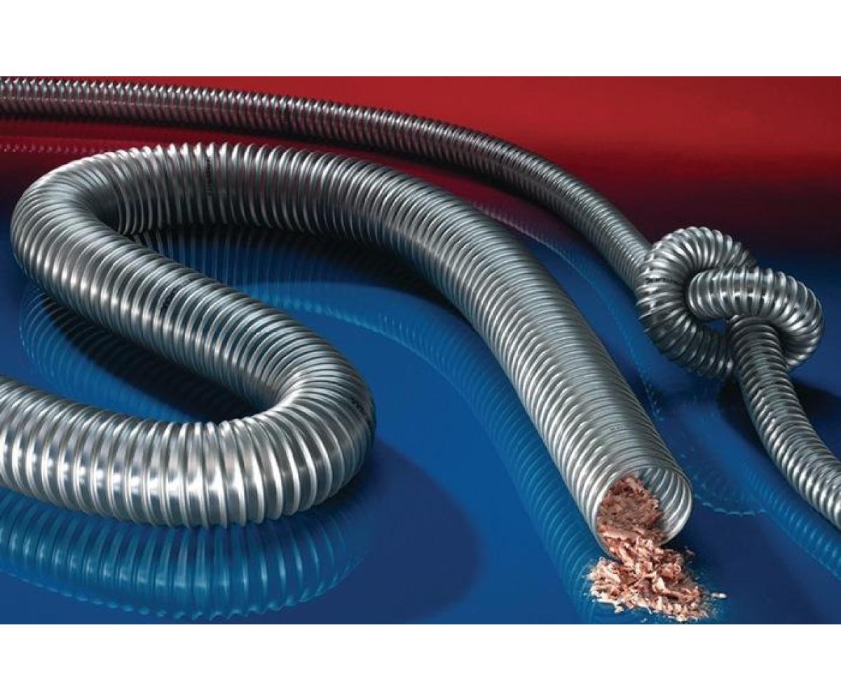 Anwendungen: Absaug-, Entstaubungs- und Filteranlage, Ölnebelabsaugung, explosionsgefährdeter Bereich, Holzstaubabsaugung, Holzspäne: Möbelproduktion, Sägewerk, Plattensäge/Säge, Holzbearbeitungs-, Kantenbearbeitungs- und Parkettschleifmaschine Eigenschaften: mittelschwere Ausführung, hochflexibel + stauchbar 3:1, abriebfest, mikrobenfest, gute Öl-, Benzin- und Chemikalienbeständigkeit, schwerentflammbar nach: DIN 4102-B1, Wandung permanent antistatisch: Durchgangswiderstand und Oberflächenwiderstand Konstruktion: 1. in der Wandung eingebetteter Federstahldraht, 2. extrudiertes Band, Wandung: gegen aggressive Hölzer und Holzschutzmittel beständiges, permanent-antistatisches Premium Polyurethan (Pre-PUR ® ), 3. Wandstärke ca. 0,6mm Temperaturbereich: -40 °C bis 90 °C, kurzzeitig bis 125 °C Liefervarianten:weitere Ausführungen, Abmessungen und Längen auf Anfrage lieferbar