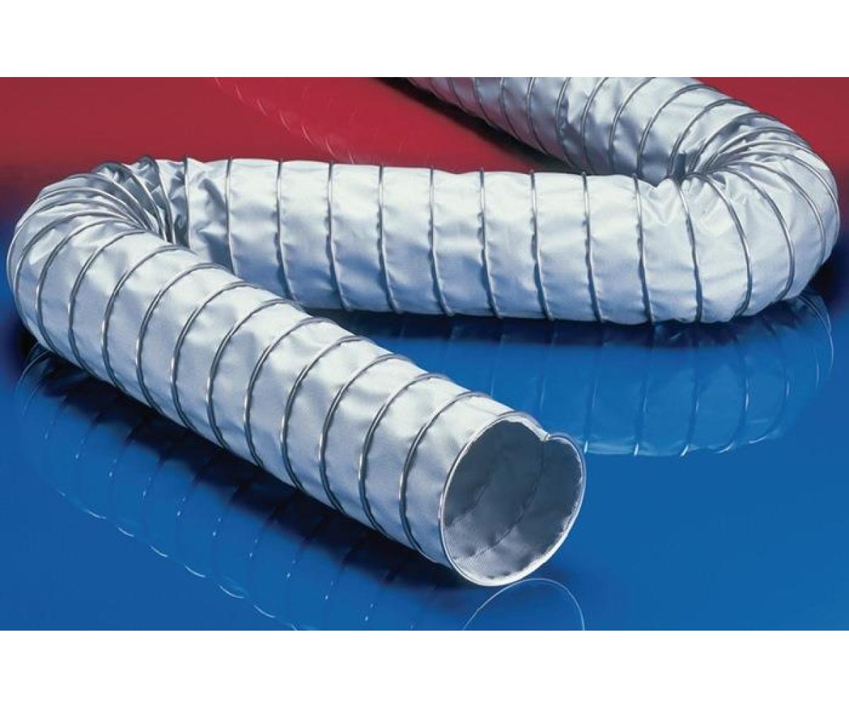 Anwendungen: flexibler Schlauch für heiße und kalte Gase, Hochtemperaturabsaugung: Öfen, Gießereien, Hochöfen, Schmelzen, Keramikindustrie, Glasindustrie, Stahlwerke, Aluminiumhütten, Dunkelstrahler, Deckenheizungen: Heißluftführung Eigenschaften: Scheuerschutz durch äußeres Klemmprofil, zugfeste Verklemmung der Wandung im Klemmprofil, hochflexibel + stauchbar 3:1, sehr gut hitzebeständig, schwerentflammbar nach: DIN 4102-B1, RoHS konform, sehr gut bei Funkenflug und Schweißspritzern Konstruktion: 1. Klemmprofil-Stützwendel: Stahl verzinkt, 2. Wandung: mit Edelstahldrähten armiertes und spezialbeschichtetes Glasgewebe Temperaturbereich: -60 °C bis 400 °C, kurzzeitig bis 450 °C Liefervarianten: weitere Ausführungen, Abmessungen und Längen auf Anfrage lieferbar