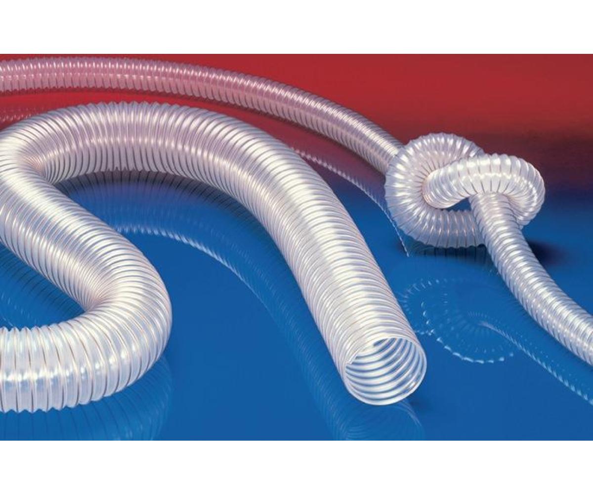 Antistatischer Polyurethanschlauch, leicht, mikrobenfest + schwerentflammbar Anwendungen:flexibler Schlauch für Gase und für abrasive Stäube, Pulver, Fasern · Leiterplatten-Bohrmaschine (PCB) · Absauganlage, Entstaubungsanlage, Filteranlage, Ölnebelabsaugung · Absaugarm · Chemieindustrie: Chemiedämpfe, Gaspendelschlauch an Verladearm, Farbdämpfe, Farbnebelabsaugung · explosionsgefährdeter Bereich · Textilindustrie, Faserabsaugung: Spinnmaschine, Strickmaschine, Webmaschine · Tierstall: Belüftung · Reinraumbelüftung, Halbleiterfertigungsmaschine · Oberflächenbearbeitung: Kugelstrahlmittel/ Sandstrahlmittel Rückführung z.B. an Strahlkabine, Schiffswerft, Stripper, Boden-Fräse, Schleifmaschine · Heizschlauch: Außenschlauch als Schutzschlauch Eigenschaften:leichte und verstärkte Ausführung · hochflexibel + stauchbar 3:1 · abriebfest · mikrobenfest · gute Öl-, Benzin- und Chemikalienbeständigkeit · sehr gute Kälteflexibilität · schwerentflammbar nach: UL94-HB · schwerentflammbar nach: DIN 4102-B1 · Wandung permanent antistatisch: Durchgangswiderstand und Oberflächenwiderstand Temperaturbereich:-40°C bis 90°C · kurzzeitig bis 125°C